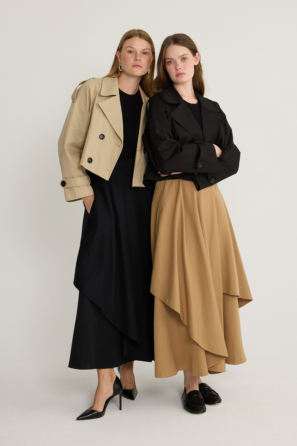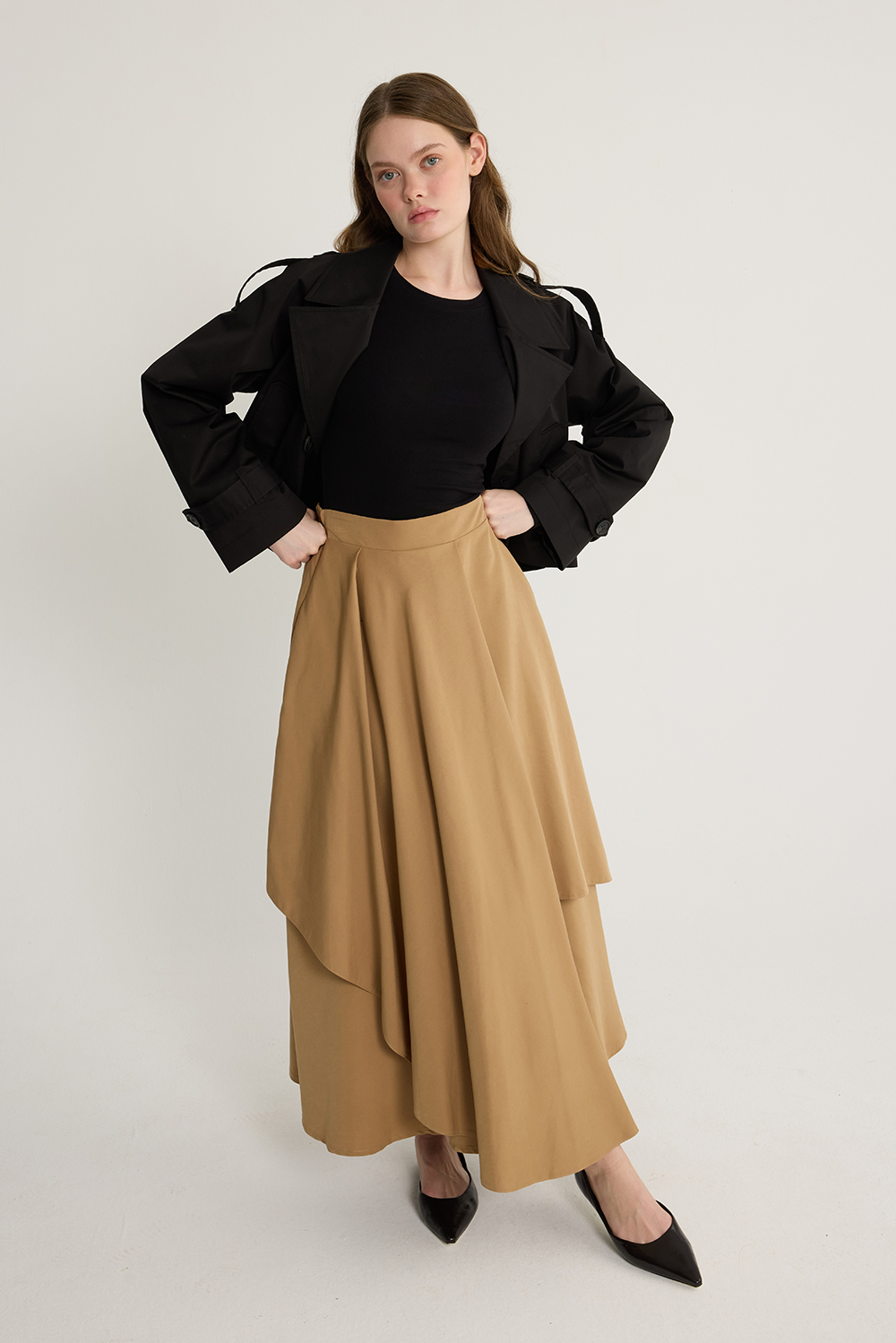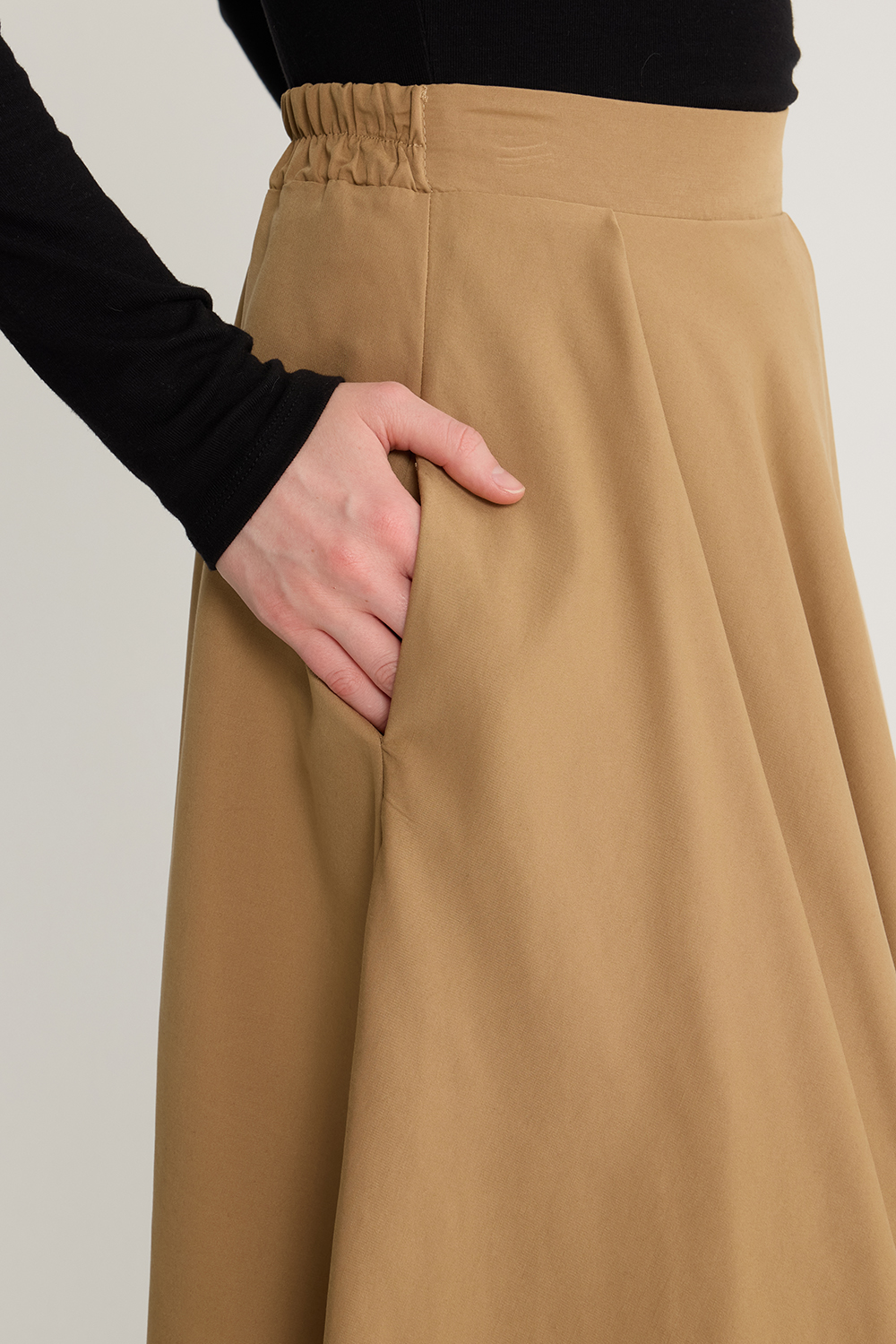 Koton kumaştır, arka bel bölümü lastikli ve yandan gizli fermuarlı, gizli cep detaylı.