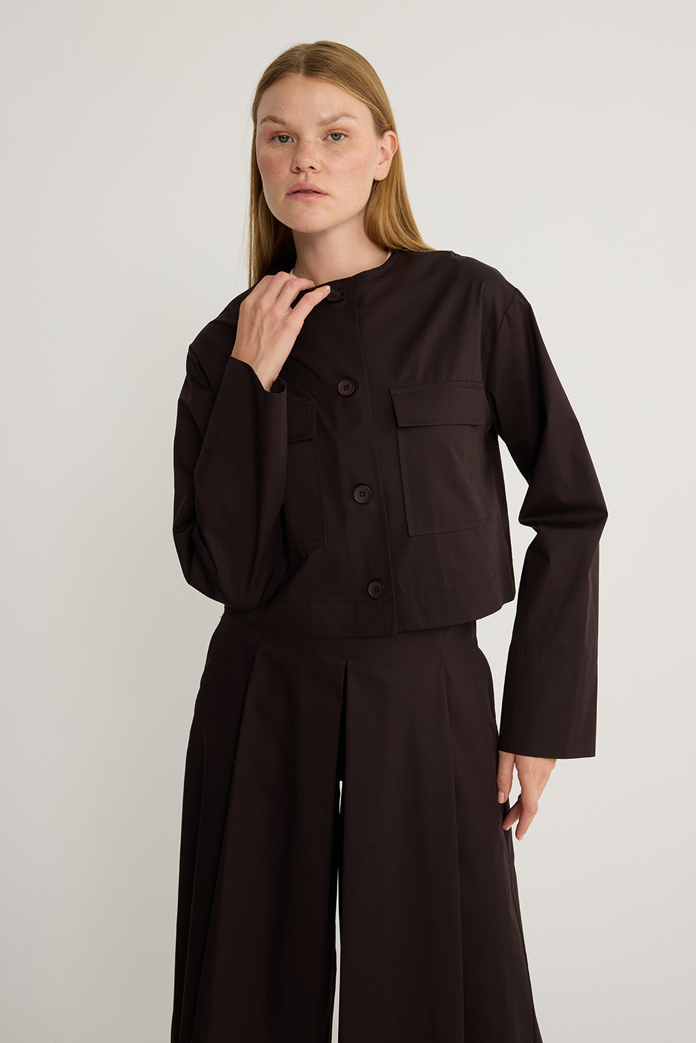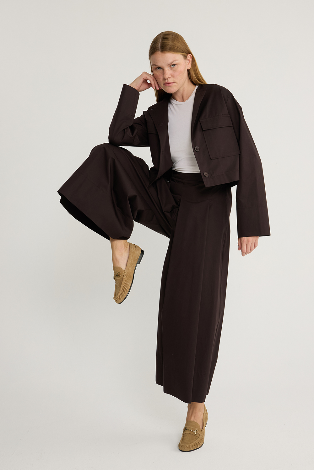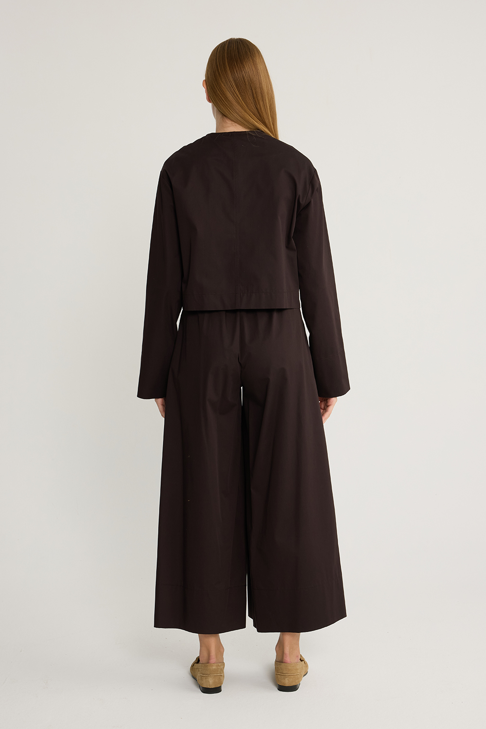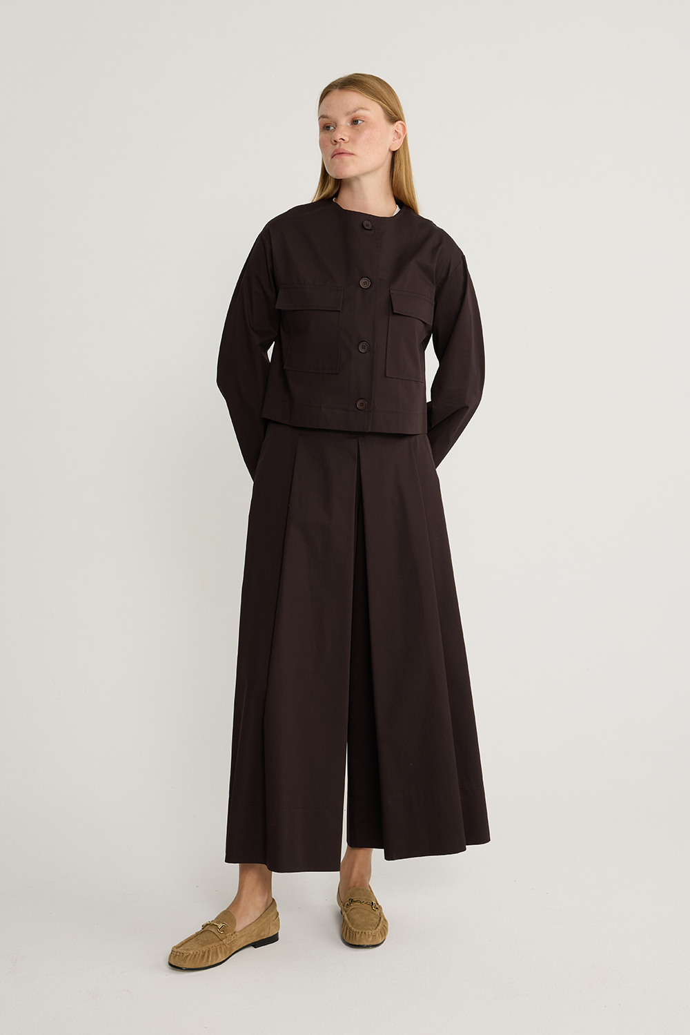 Koton kumaş, önden düğmeli, cep detaylı, etek formunda bol paça pantolon, pantolon arka bel bölümü lastikli ve yandan gizli fermuarlı.