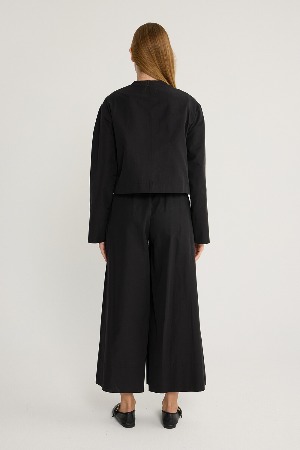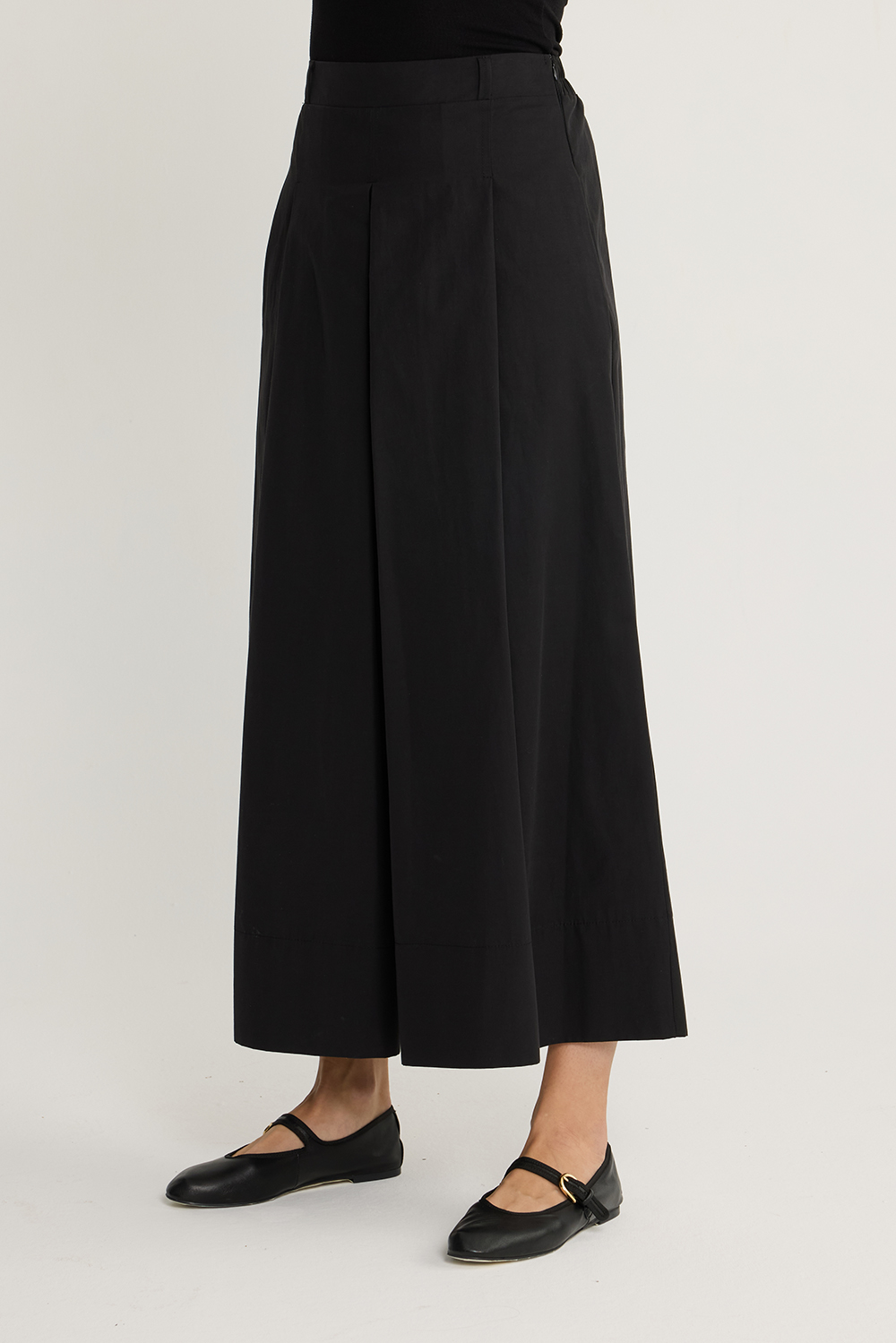 Koton kumaş, önden düğmeli, cep detaylı, etek formunda bol paça pantolon, pantolon arka bel bölümü lastikli ve yandan gizli fermuarlı.