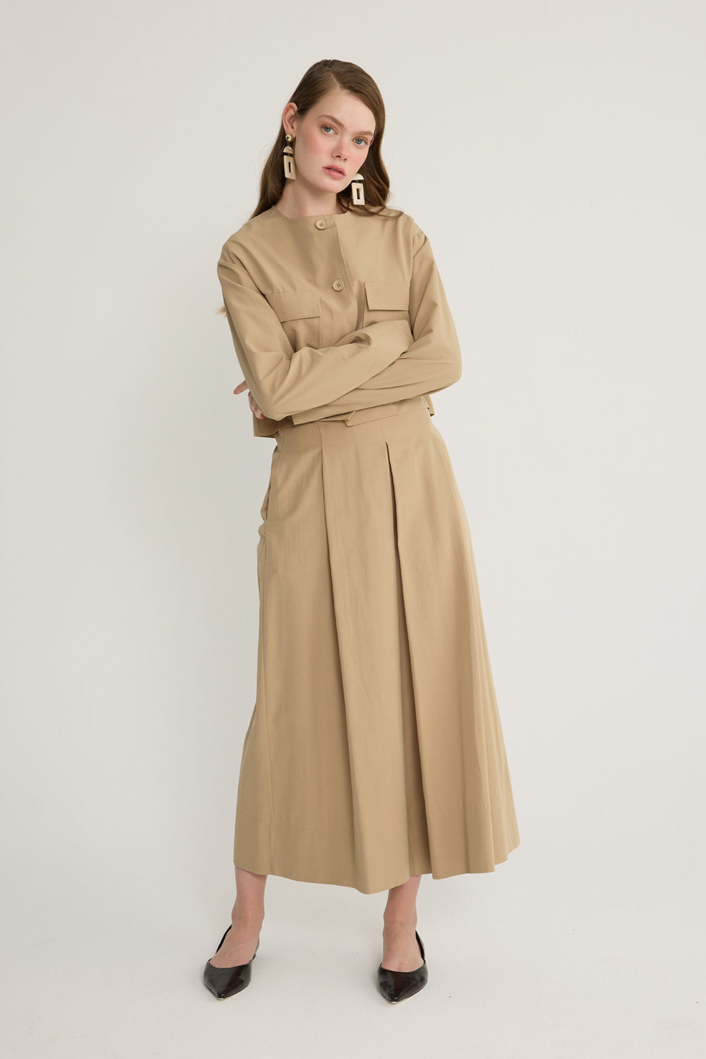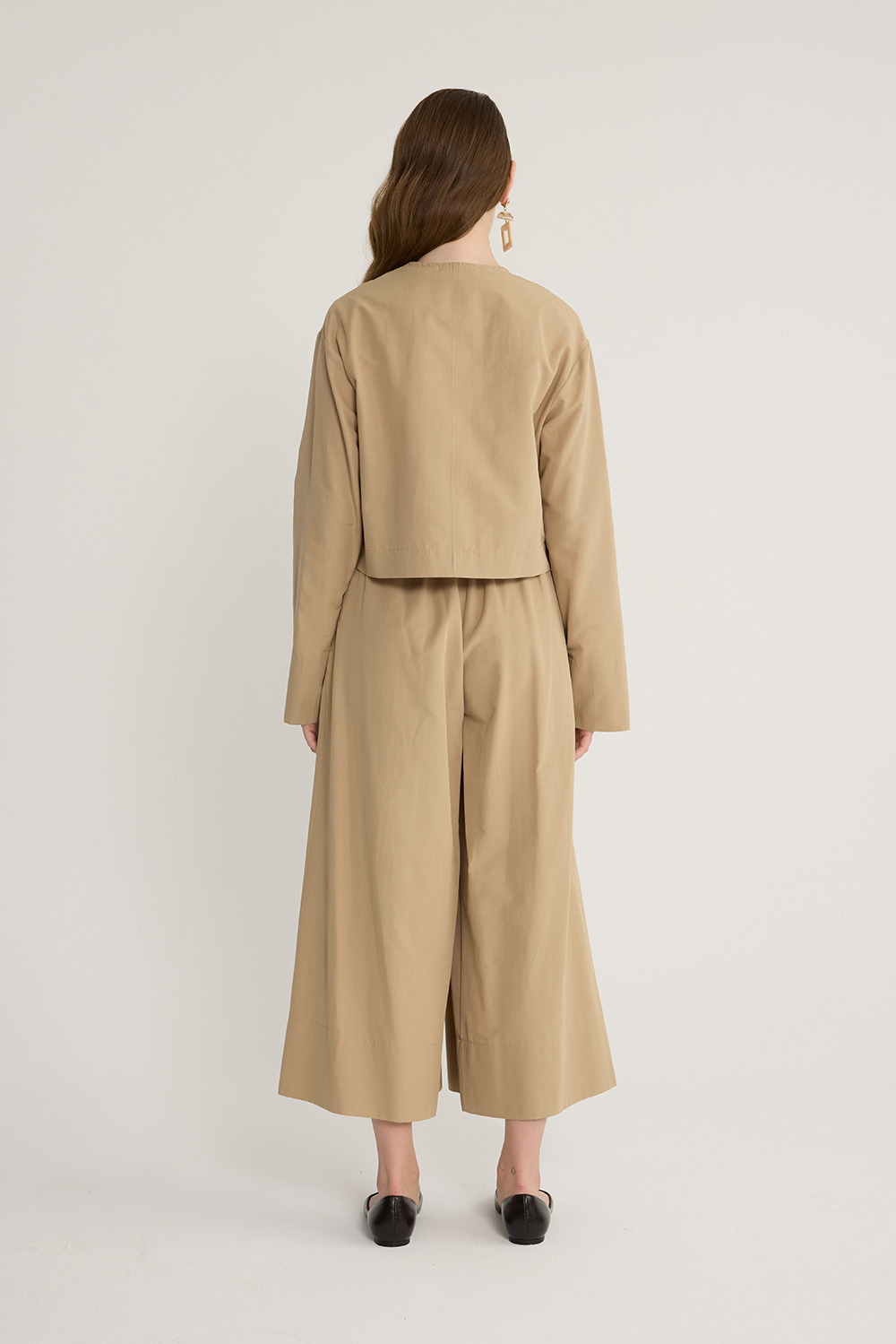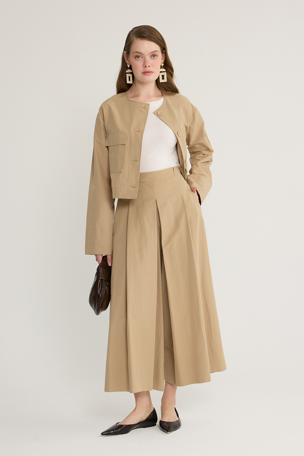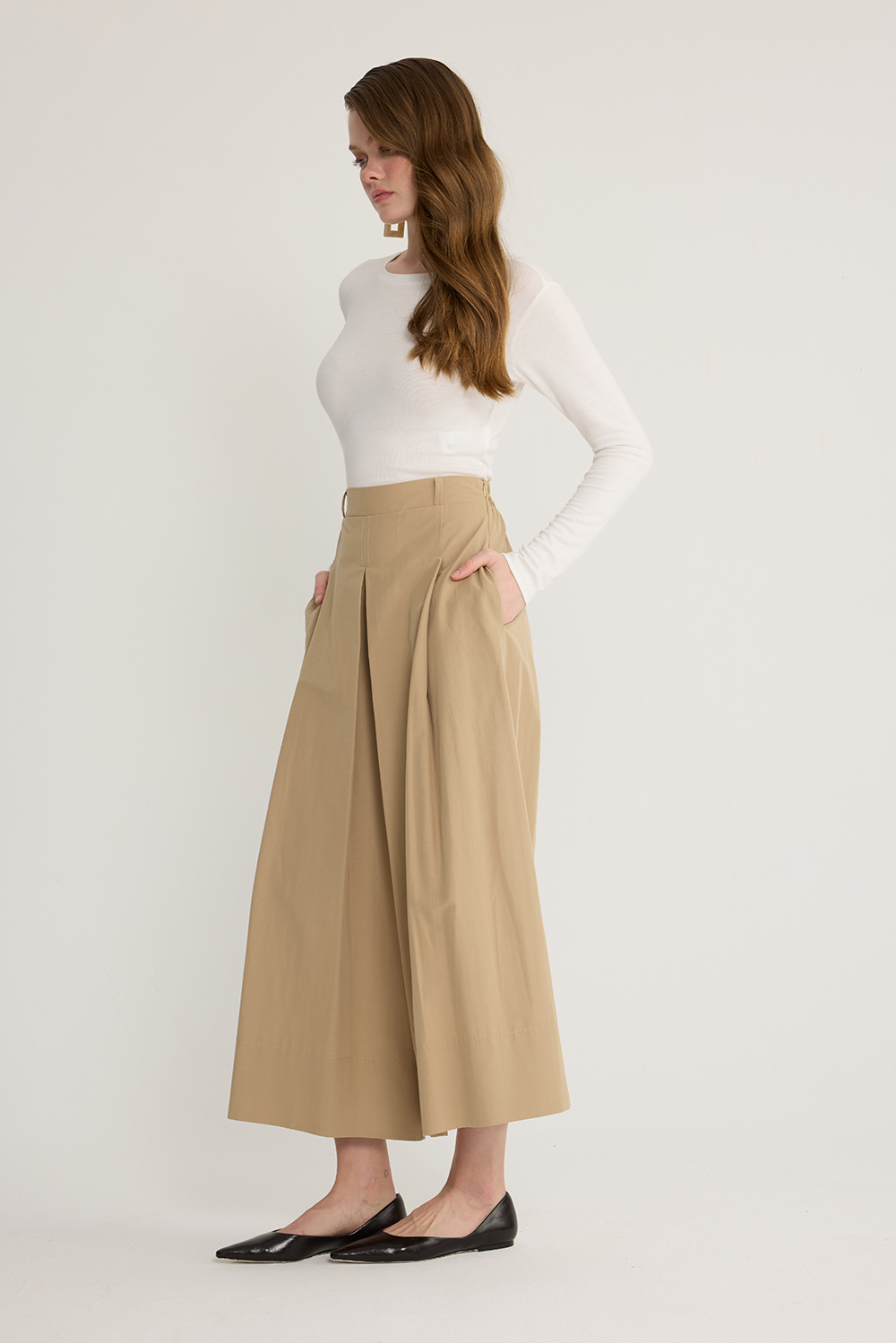 Koton kumaş, önden düğmeli, cep detaylı, etek formunda bol paça pantolon, pantolon arka bel bölümü lastikli ve yandan gizli fermuarlı.