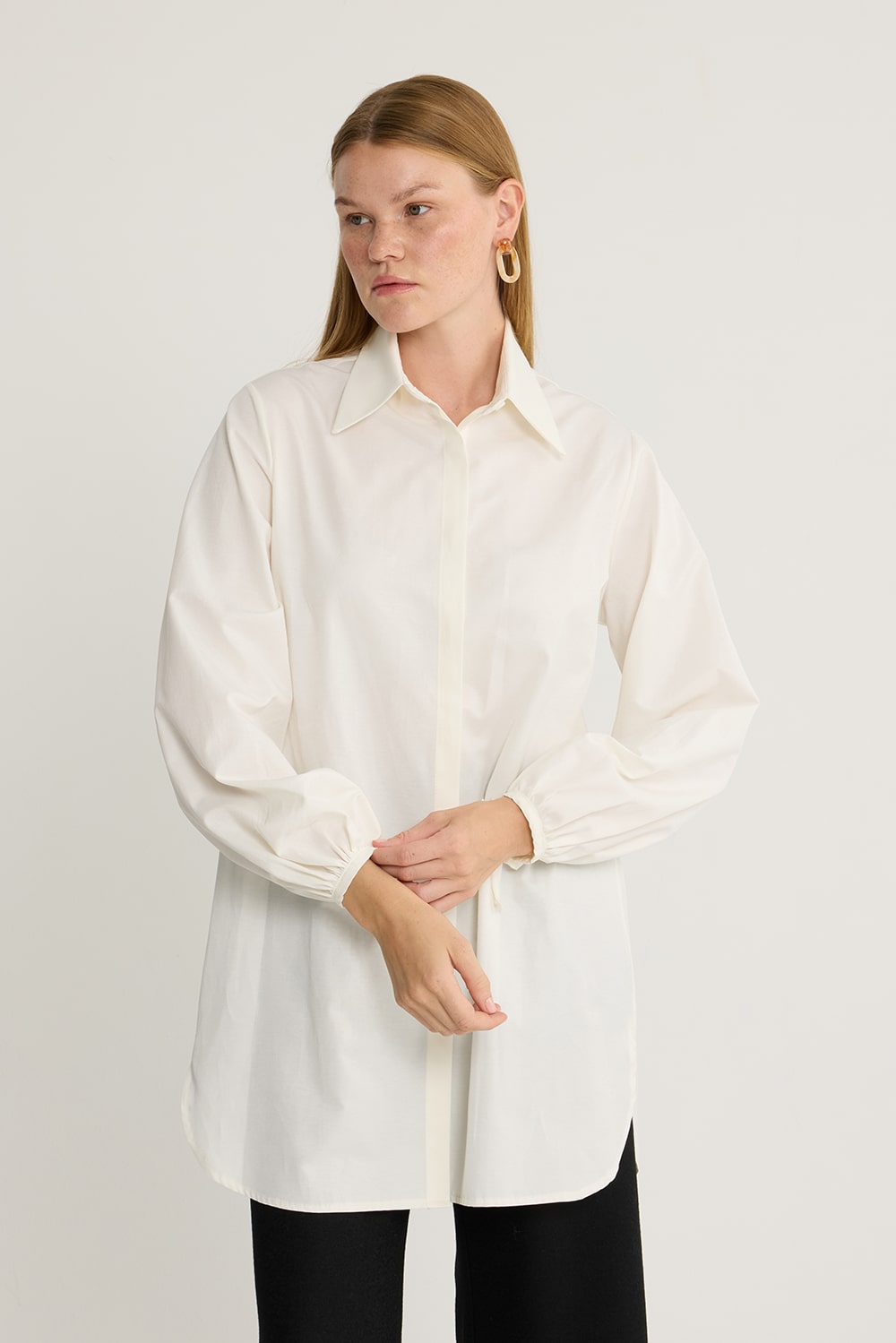 Koton kumaş, önü komple düğmeli, kolu bağlamalı.