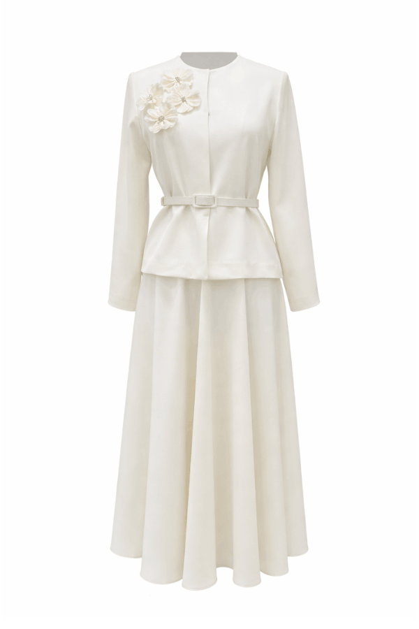 Ceket seyyar kemerli ve önü komple çıtçıtlı. Etek arka bel bölümü lastikli ve yandan gizli fermuarlı. Ürün astarlıdır. İthal krep saten kumaştır.