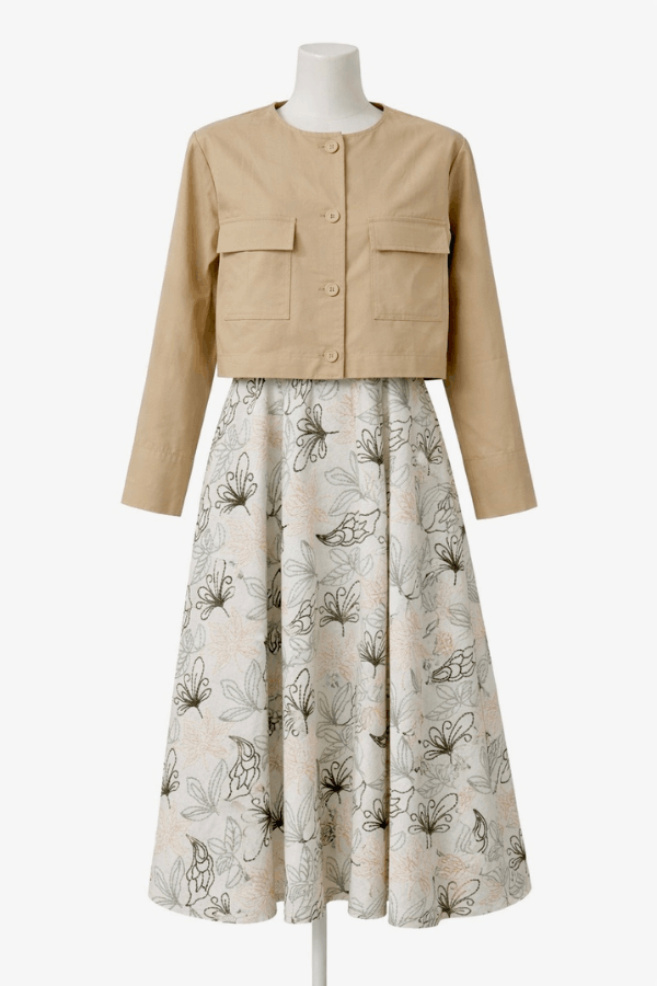 Nakışlı ince gabardin kumaş, cep detaylı, etek arka bel bölümü lastikli ve yandan gizli fermuarlı.