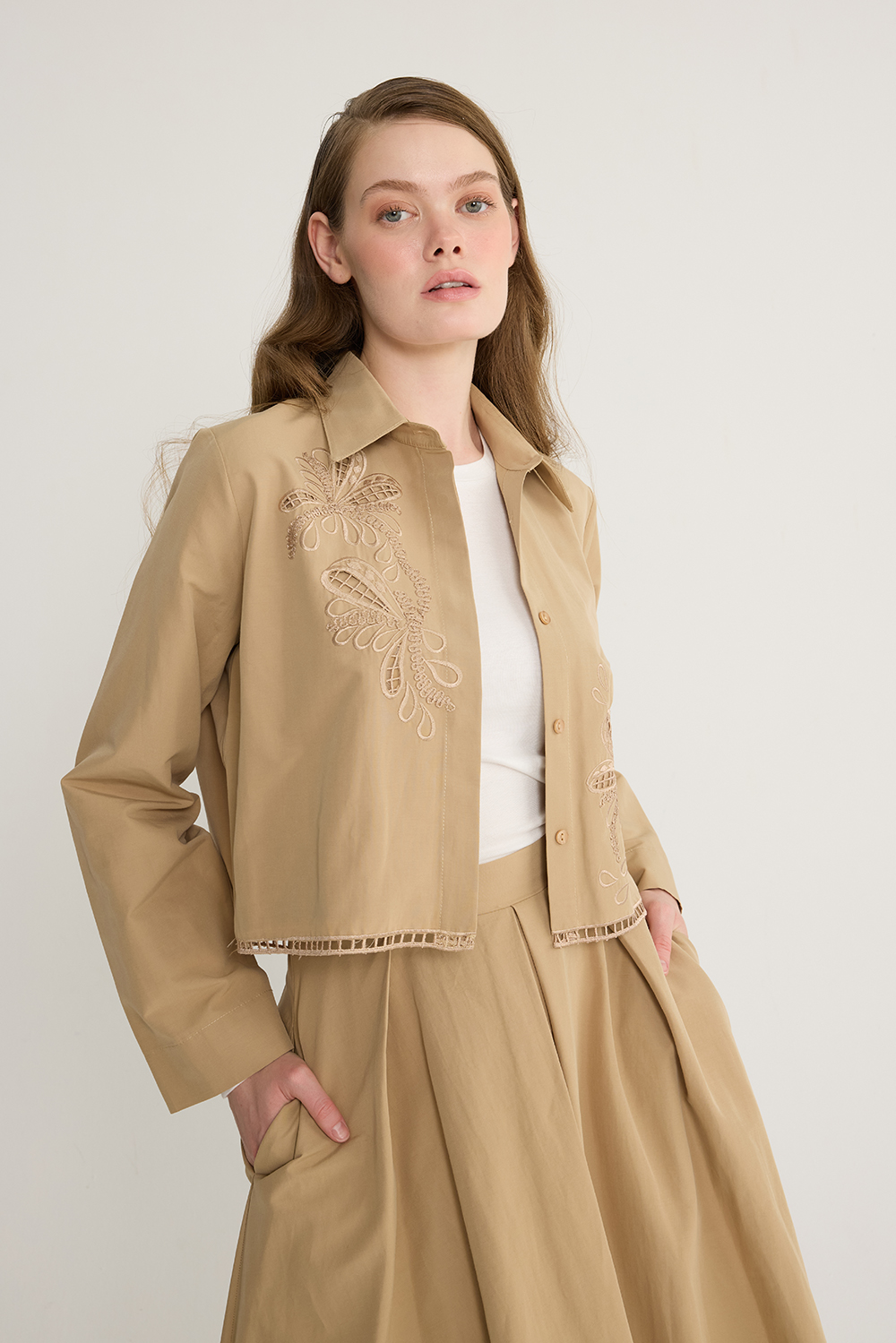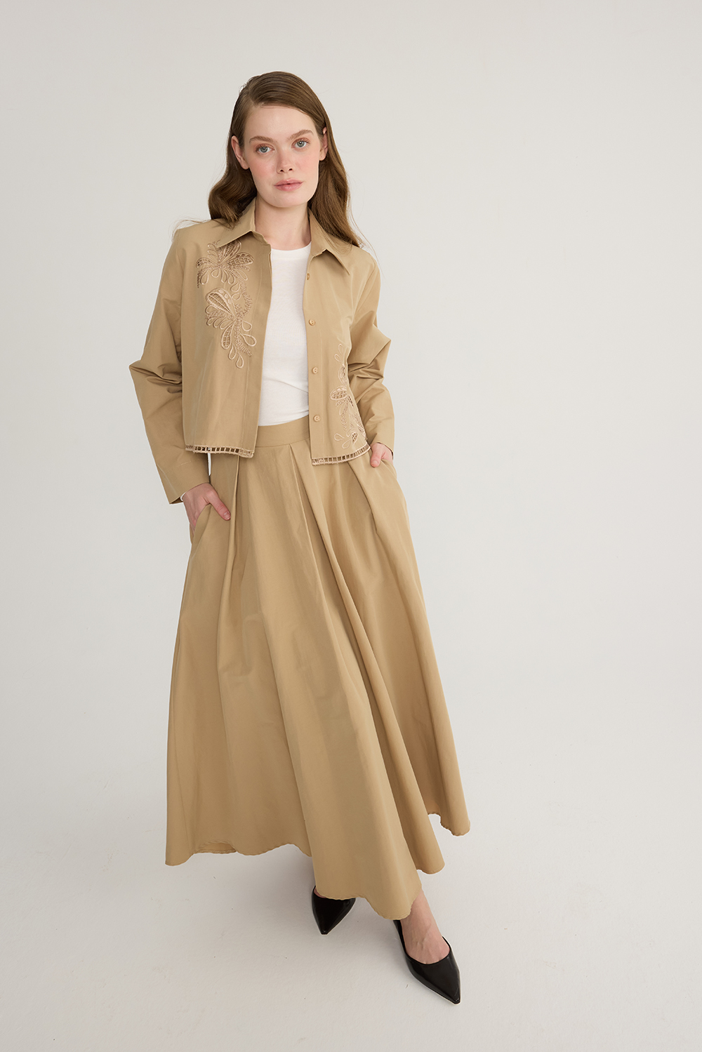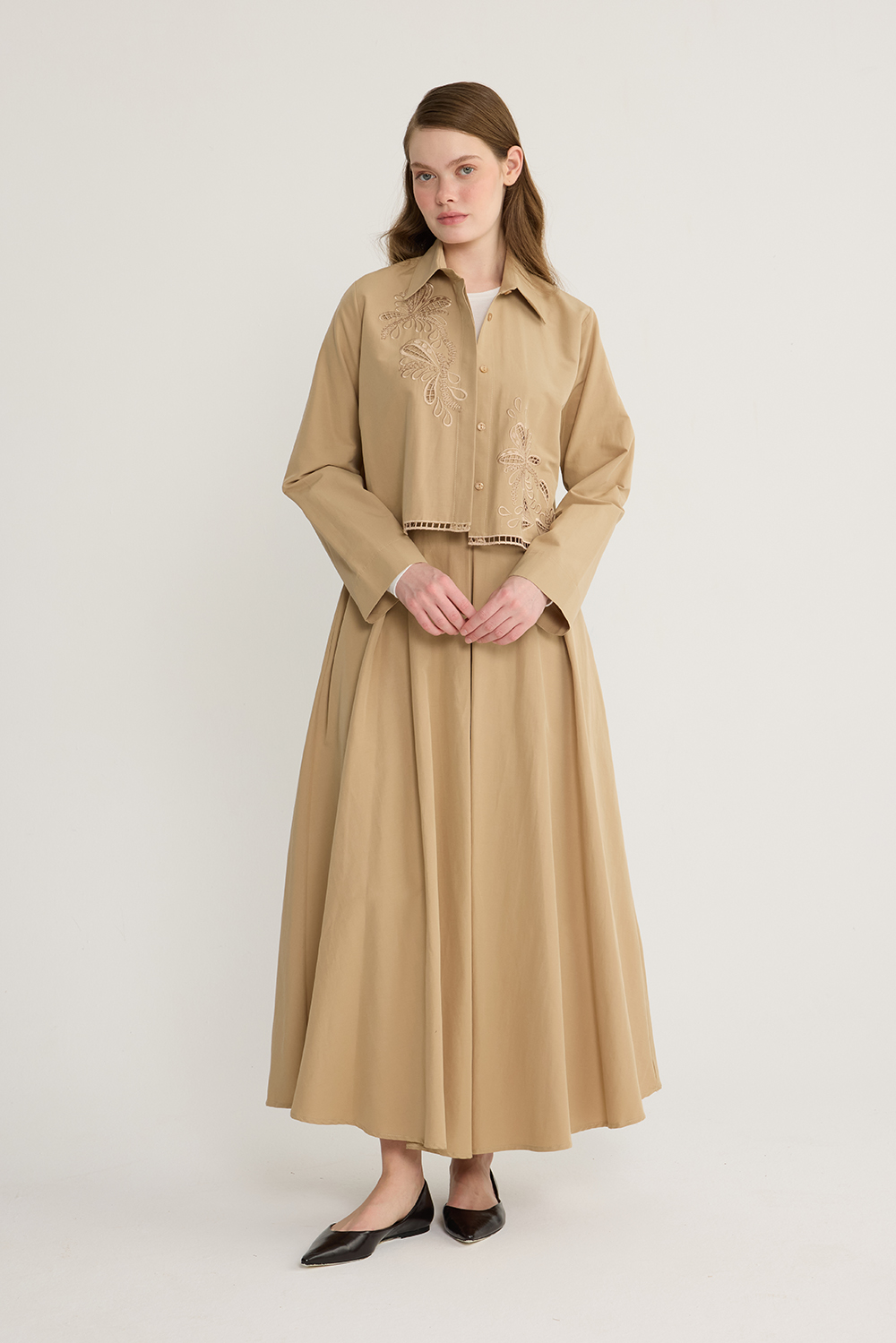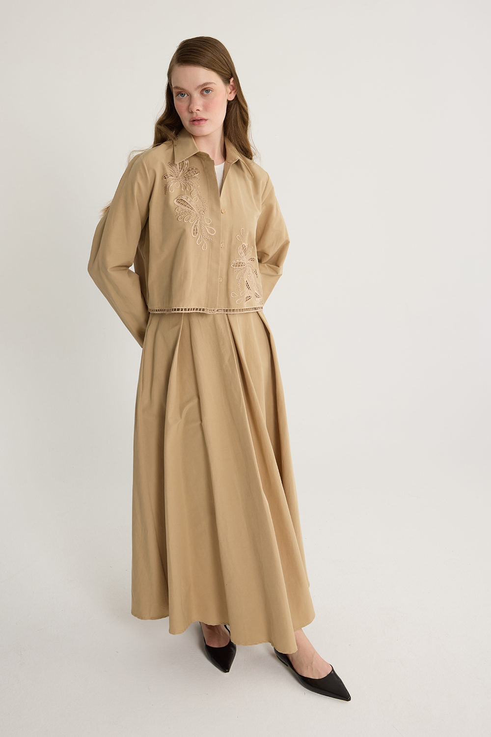 Koton kumaş, önden gizli düğmeli, etek arka bel bölümü lastikli ve yandan gizli fermuarlı, cep detaylı.