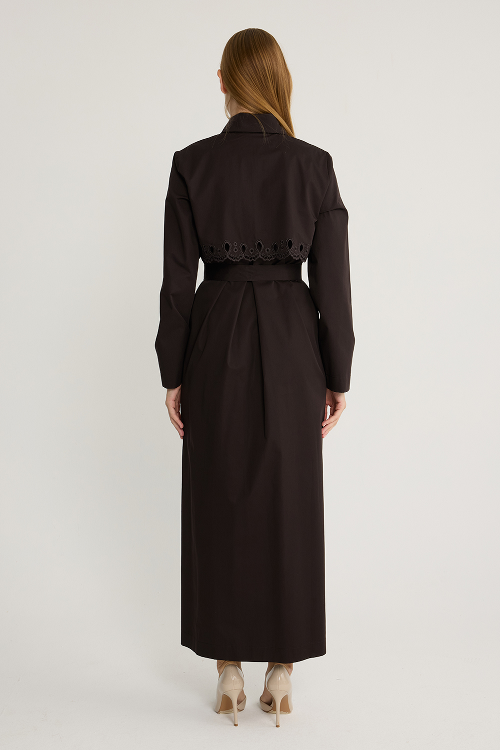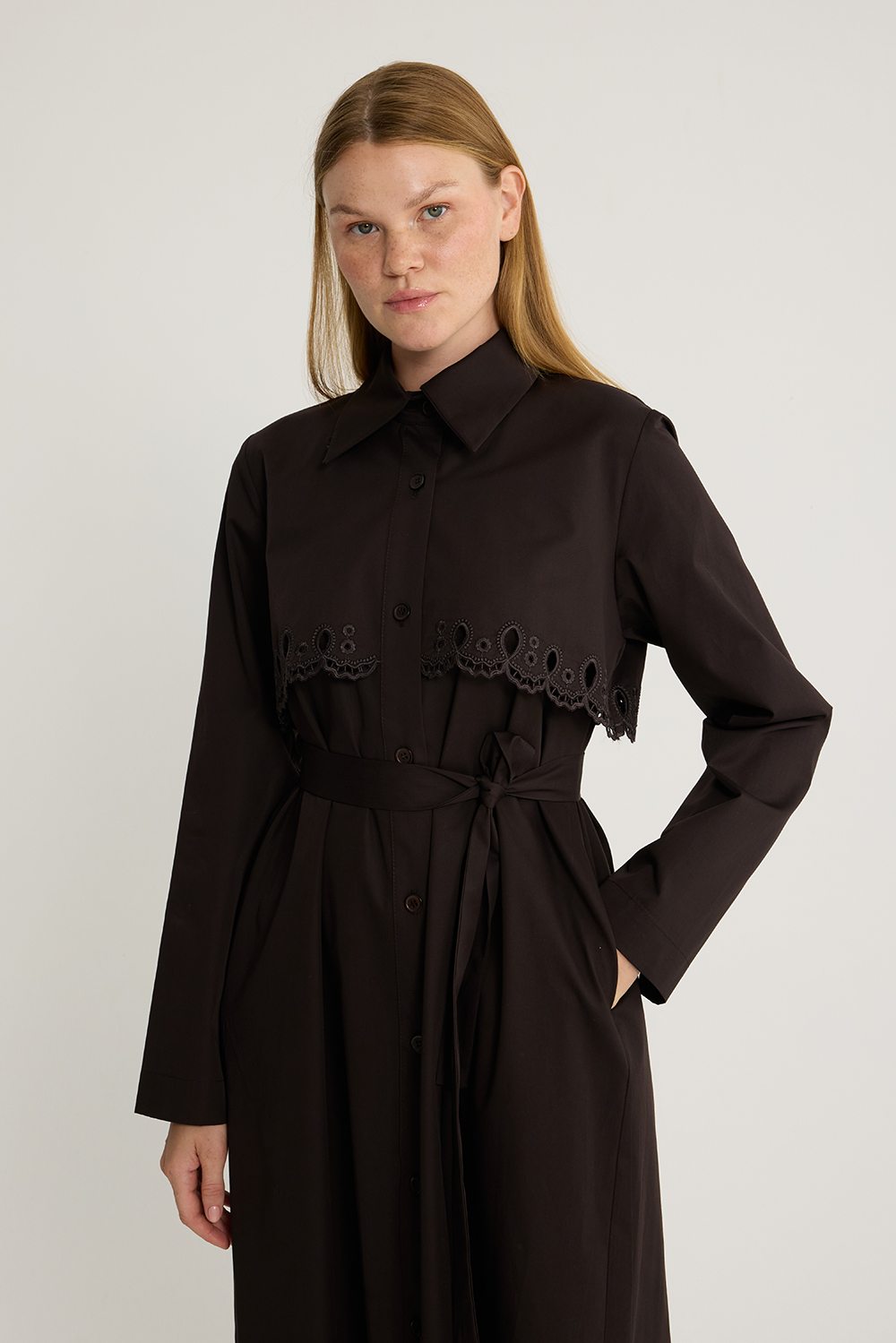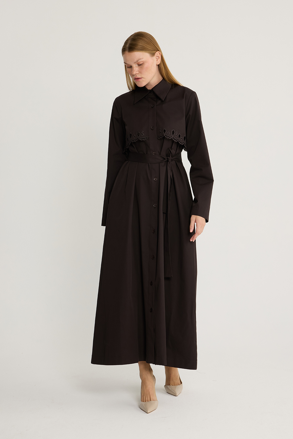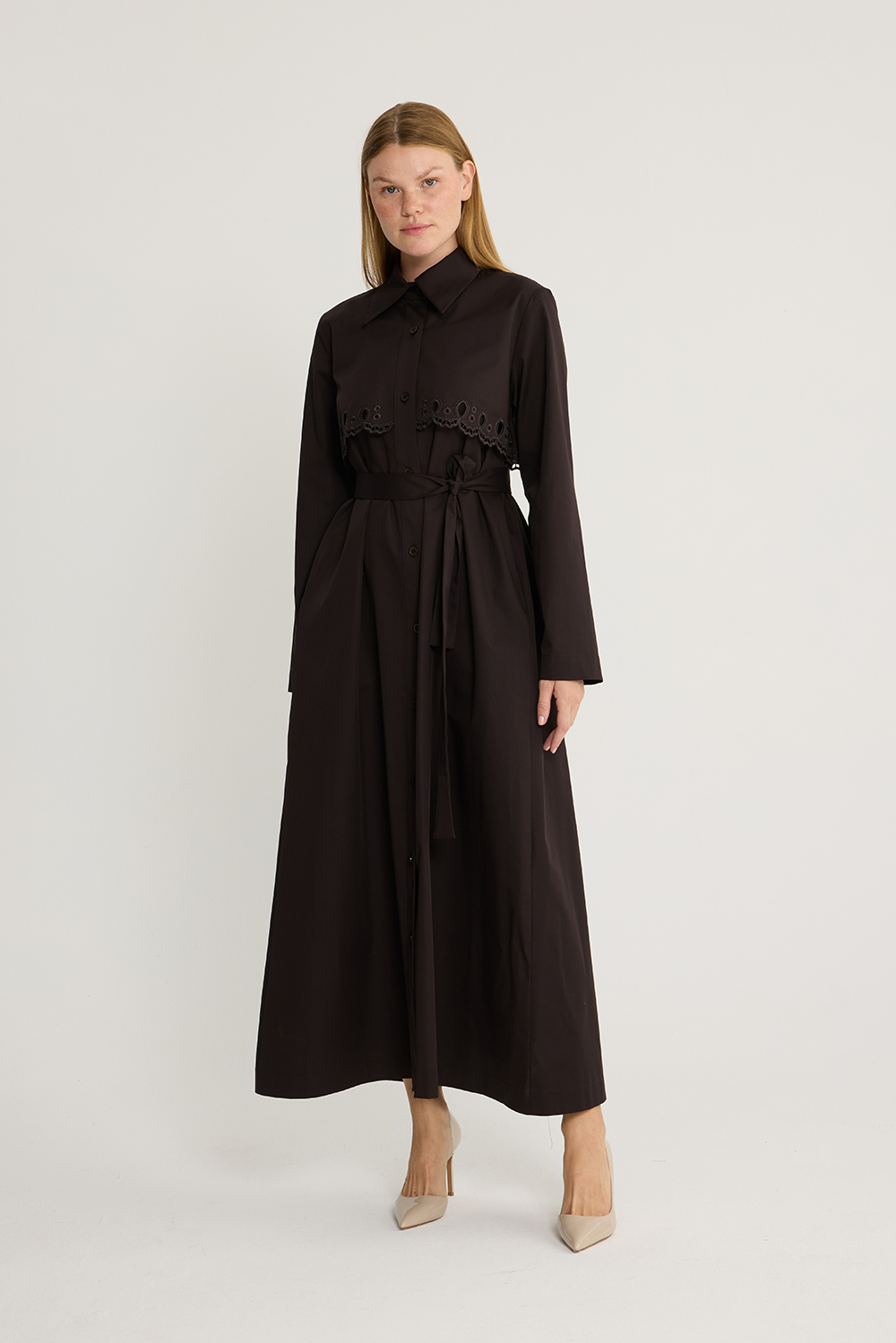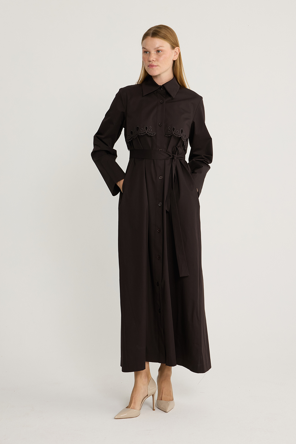 Koton kumaş, nakış detaylı, boydan düğmeli, seyyar kuşaklı, cep detaylı.
