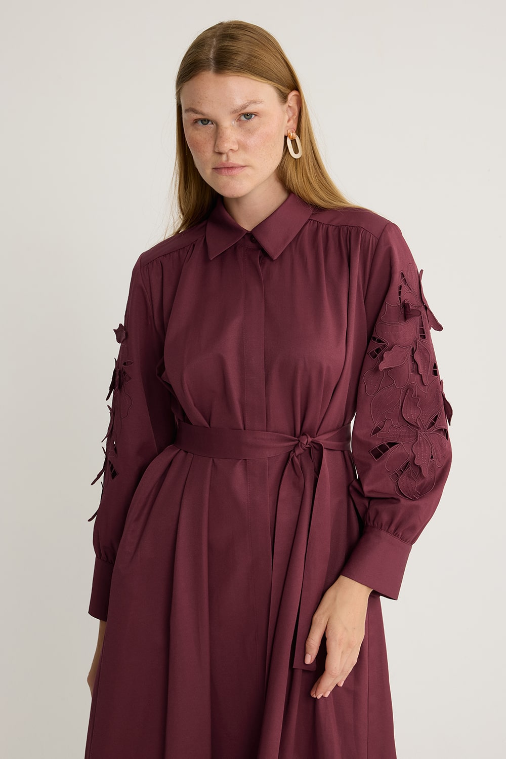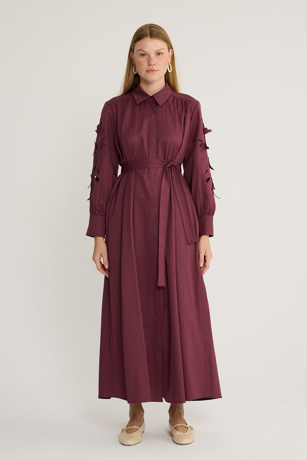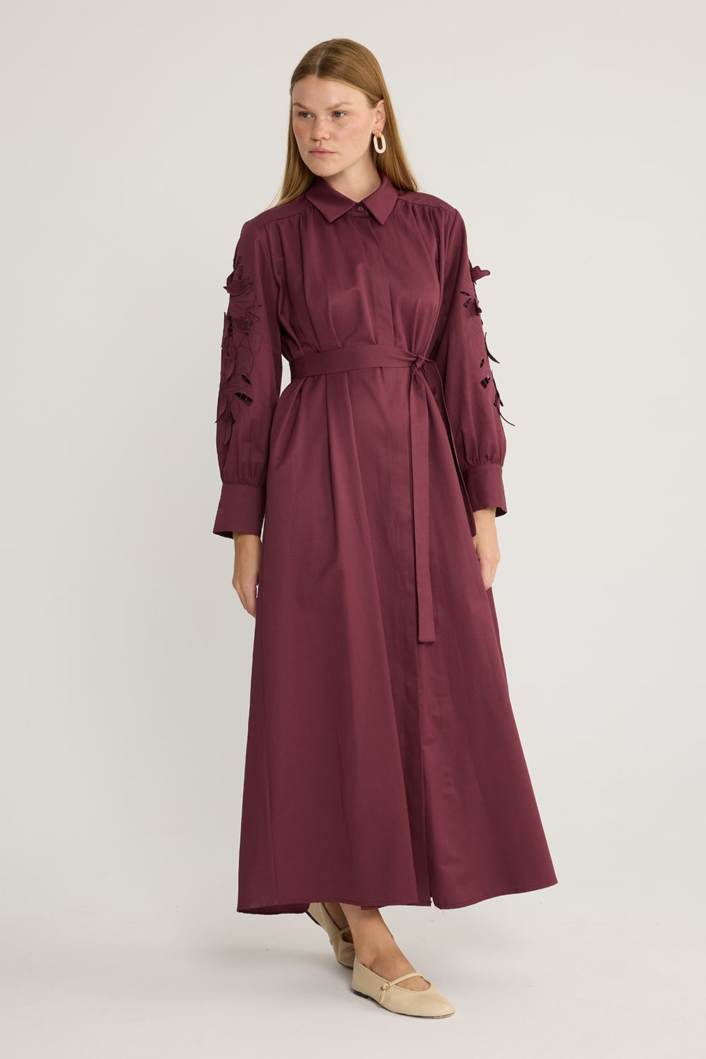 Koton kumaş, kolu nakış detaylı, seyyar kuşağı mevcut, nakış kısımları kendinden astarlı olup iç göstermez.