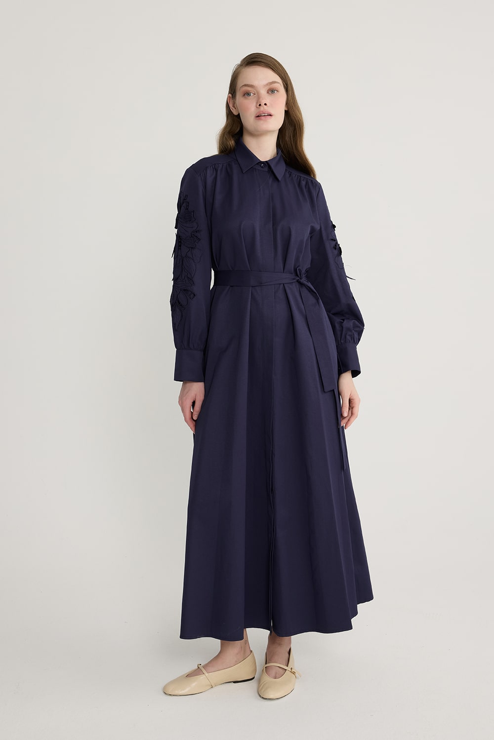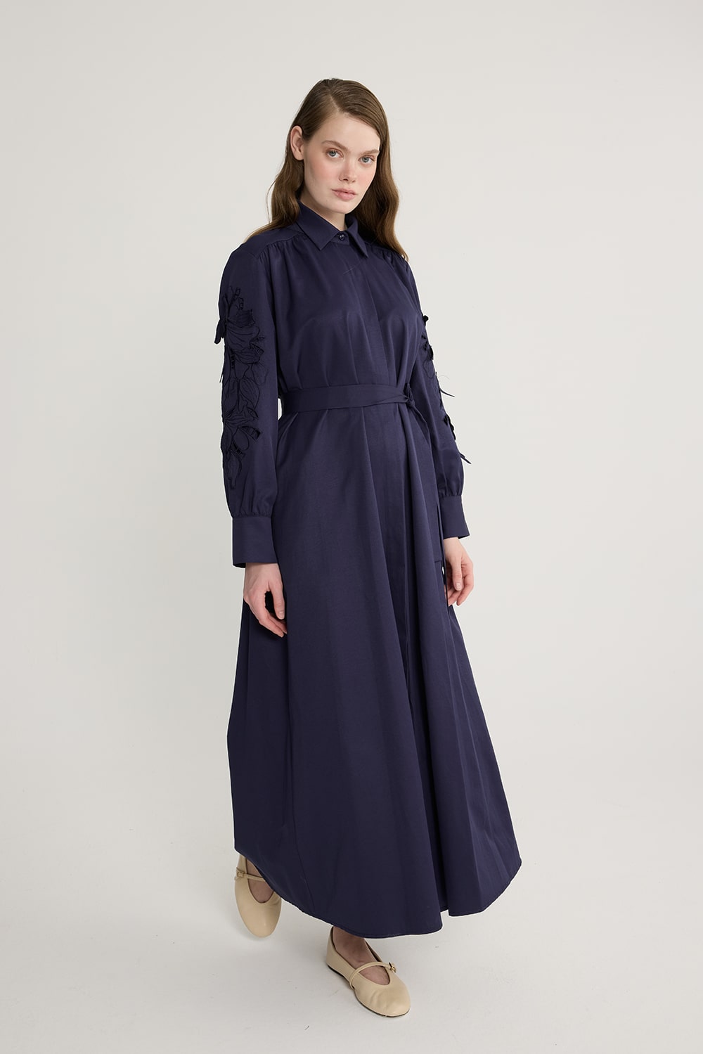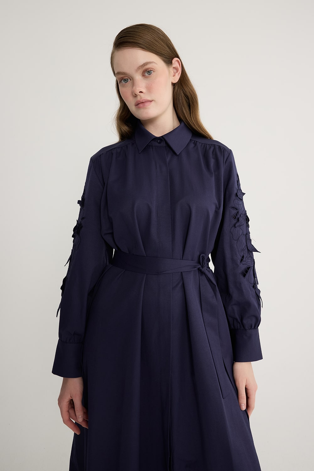 Koton kumaş, kolu nakış detaylı, seyyar kuşağı mevcut, nakış kısımları kendinden astarlı olup iç göstermez.