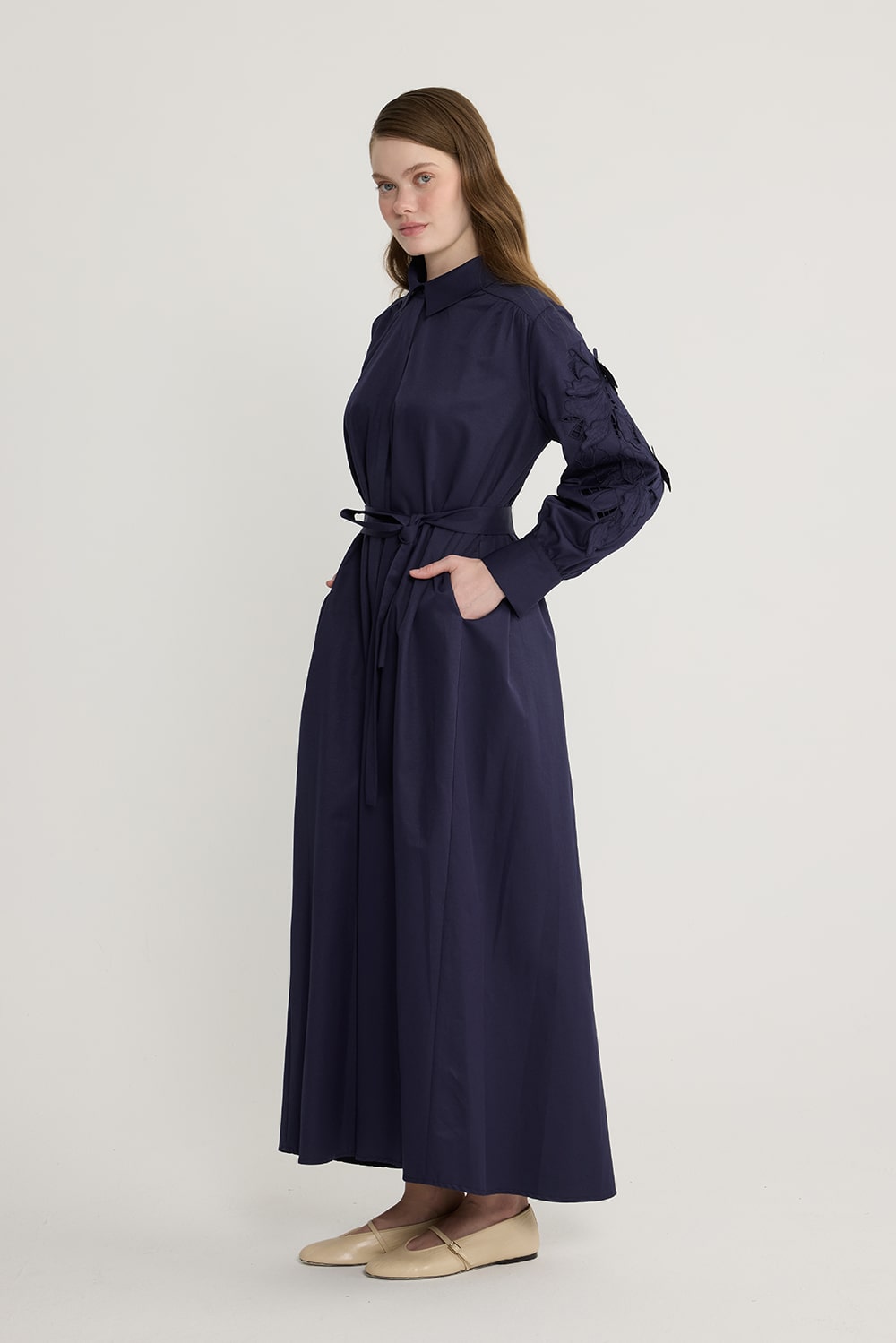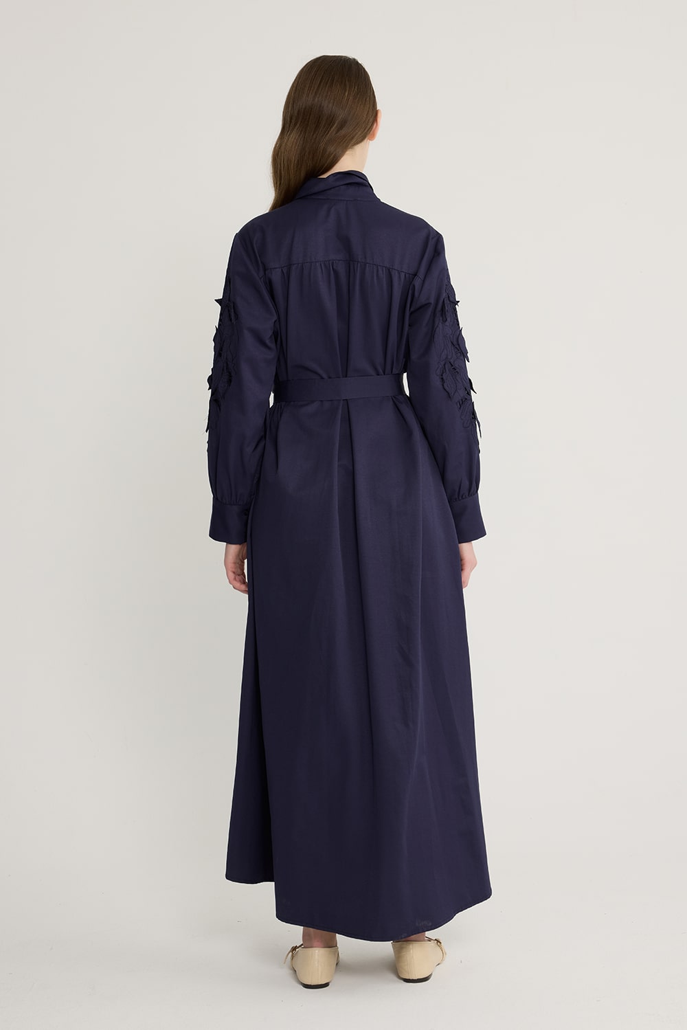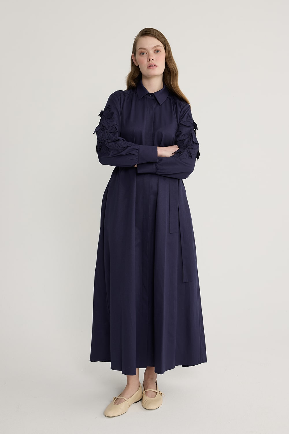 Koton kumaş, kolu nakış detaylı, seyyar kuşağı mevcut, nakış kısımları kendinden astarlı olup iç göstermez.
