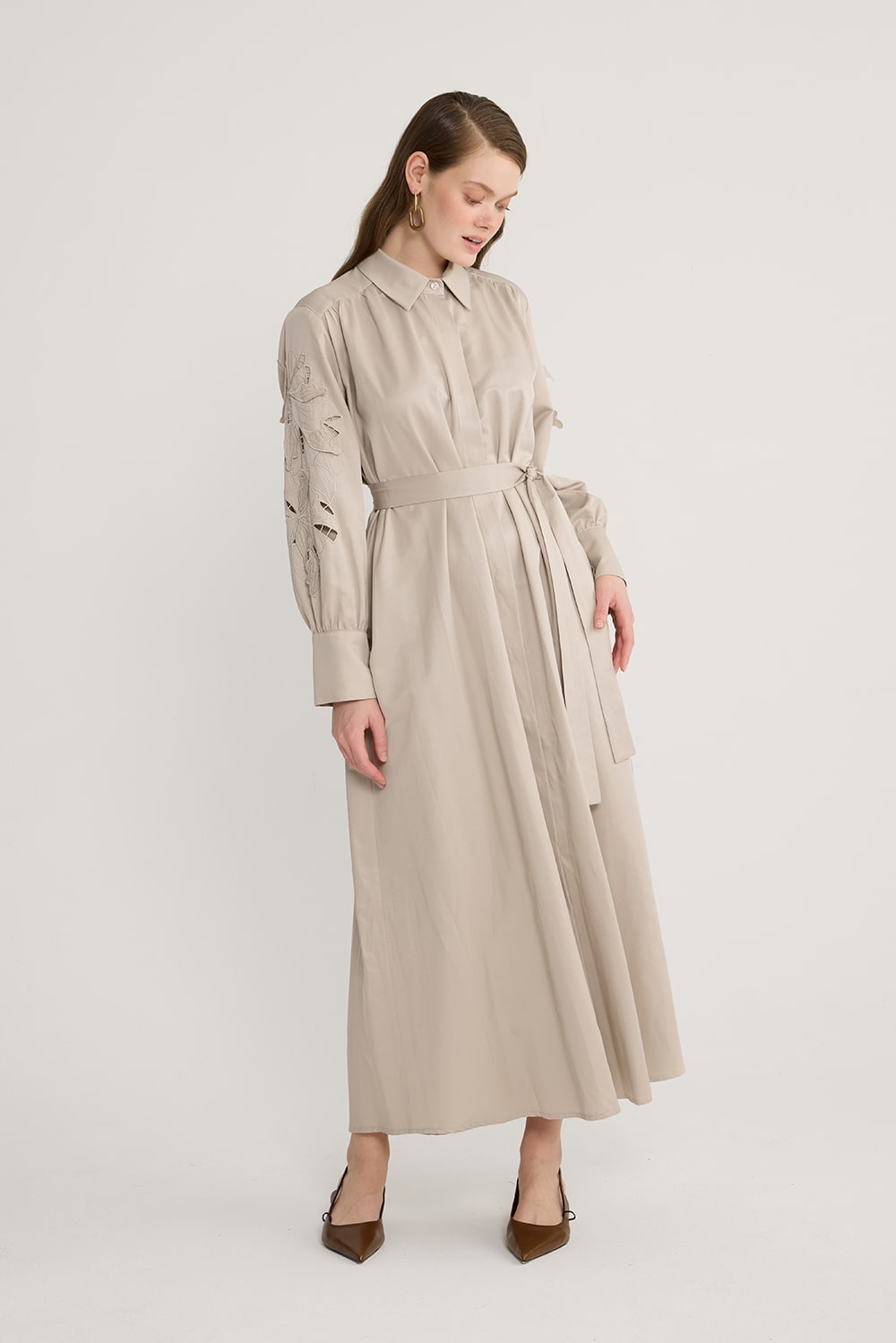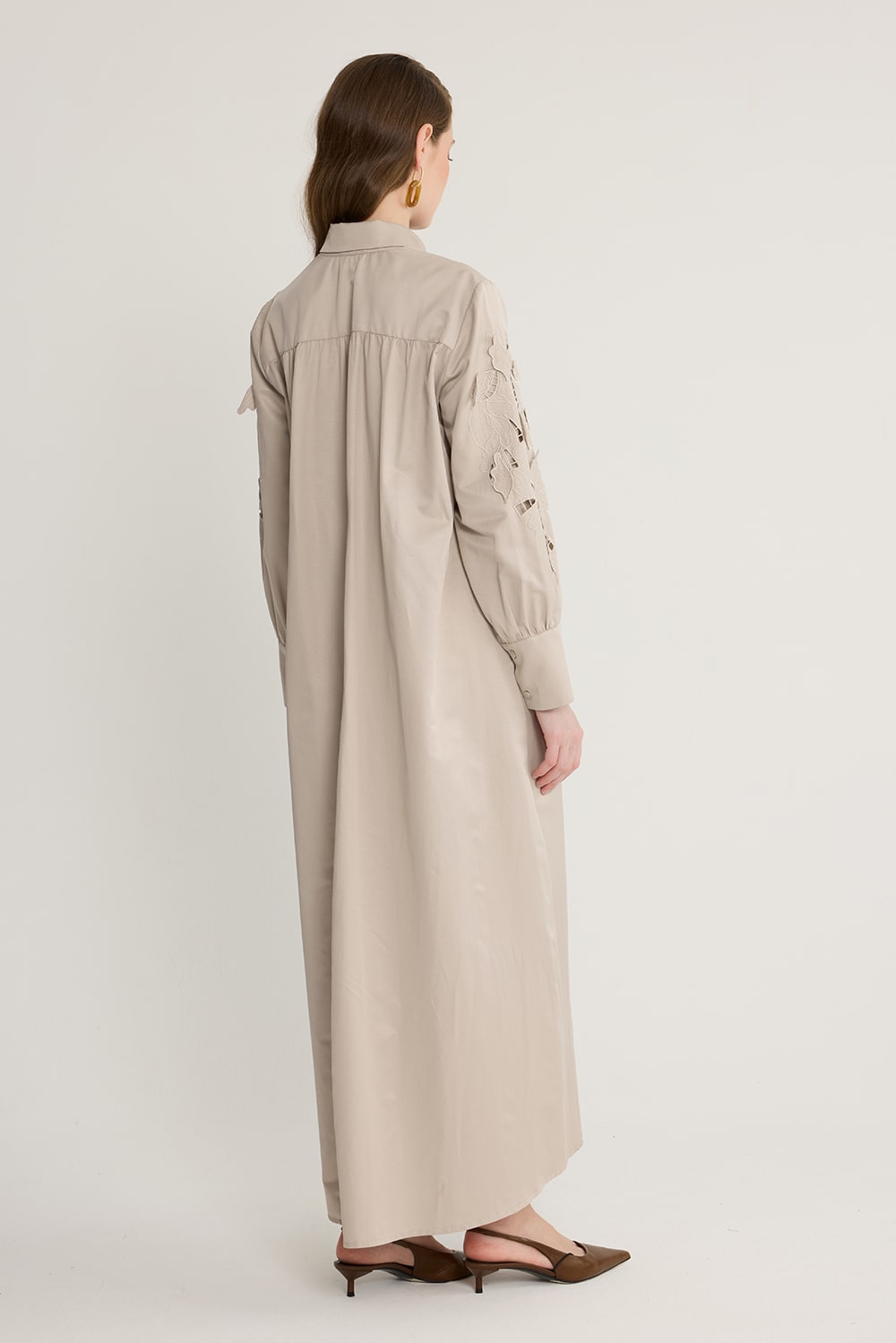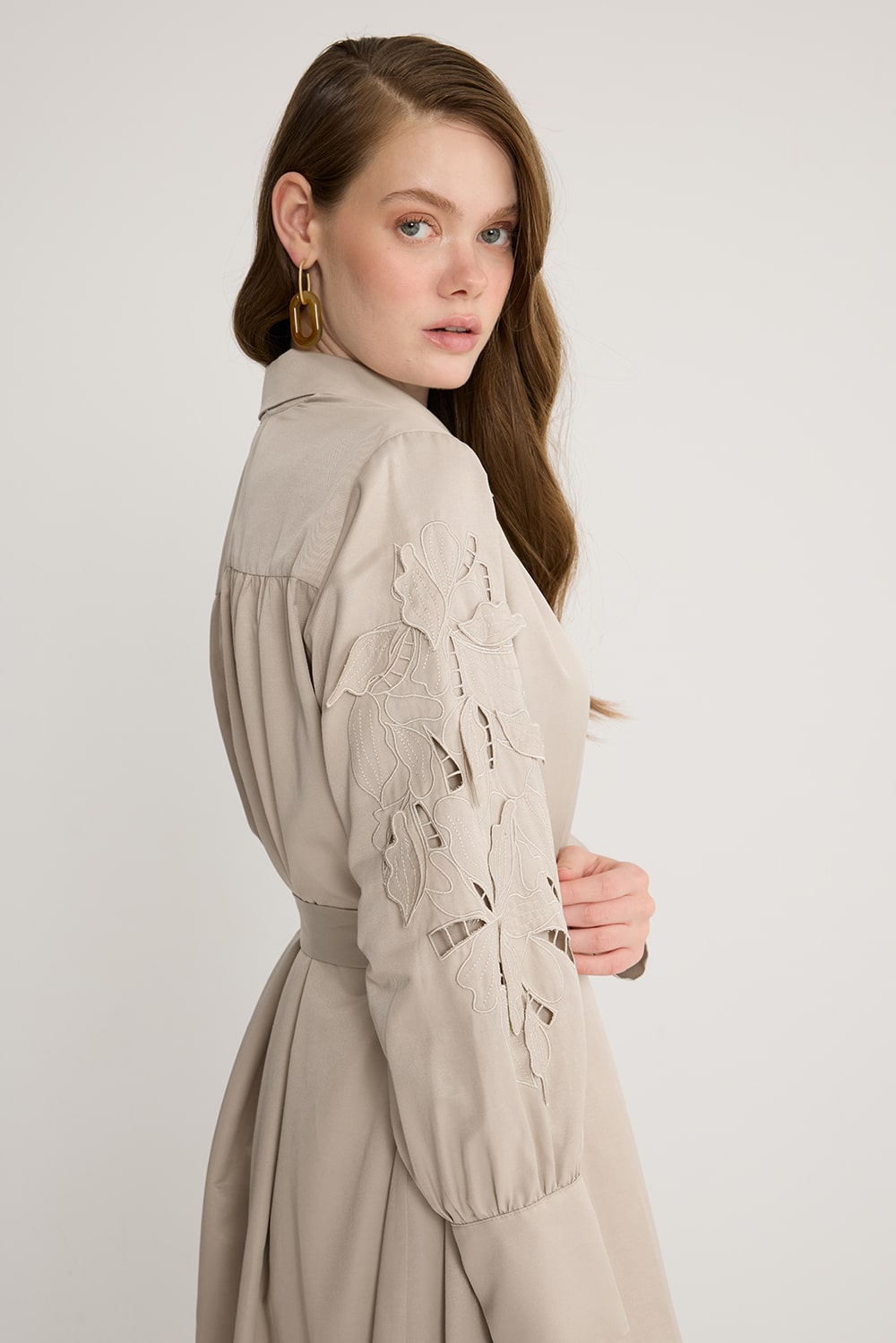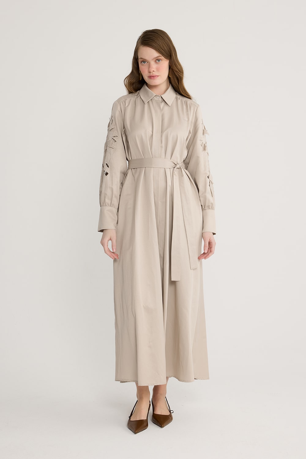 Koton kumaş, kolu nakış detaylı, seyyar kuşağı mevcut, nakış kısımları kendinden astarlı olup iç göstermez.