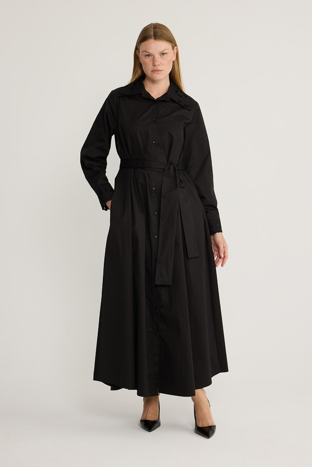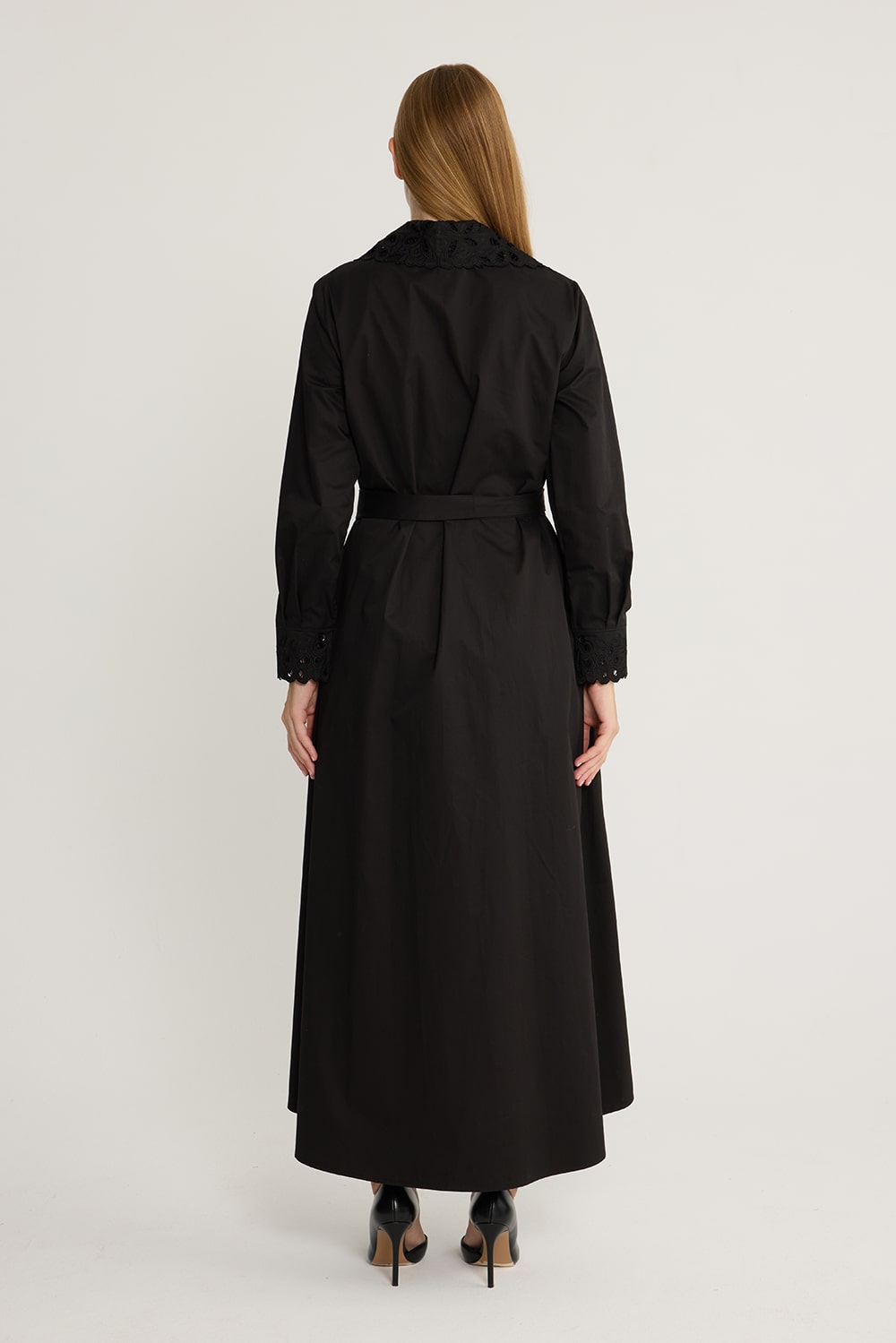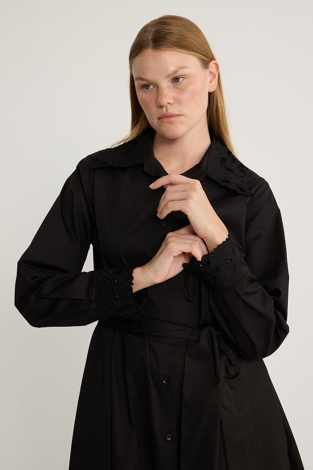 Koton kumaş, yaka ve kol manşeti nakış detaylı, boydan düğmeli, seyyar kuşaklı, cep detaylı.