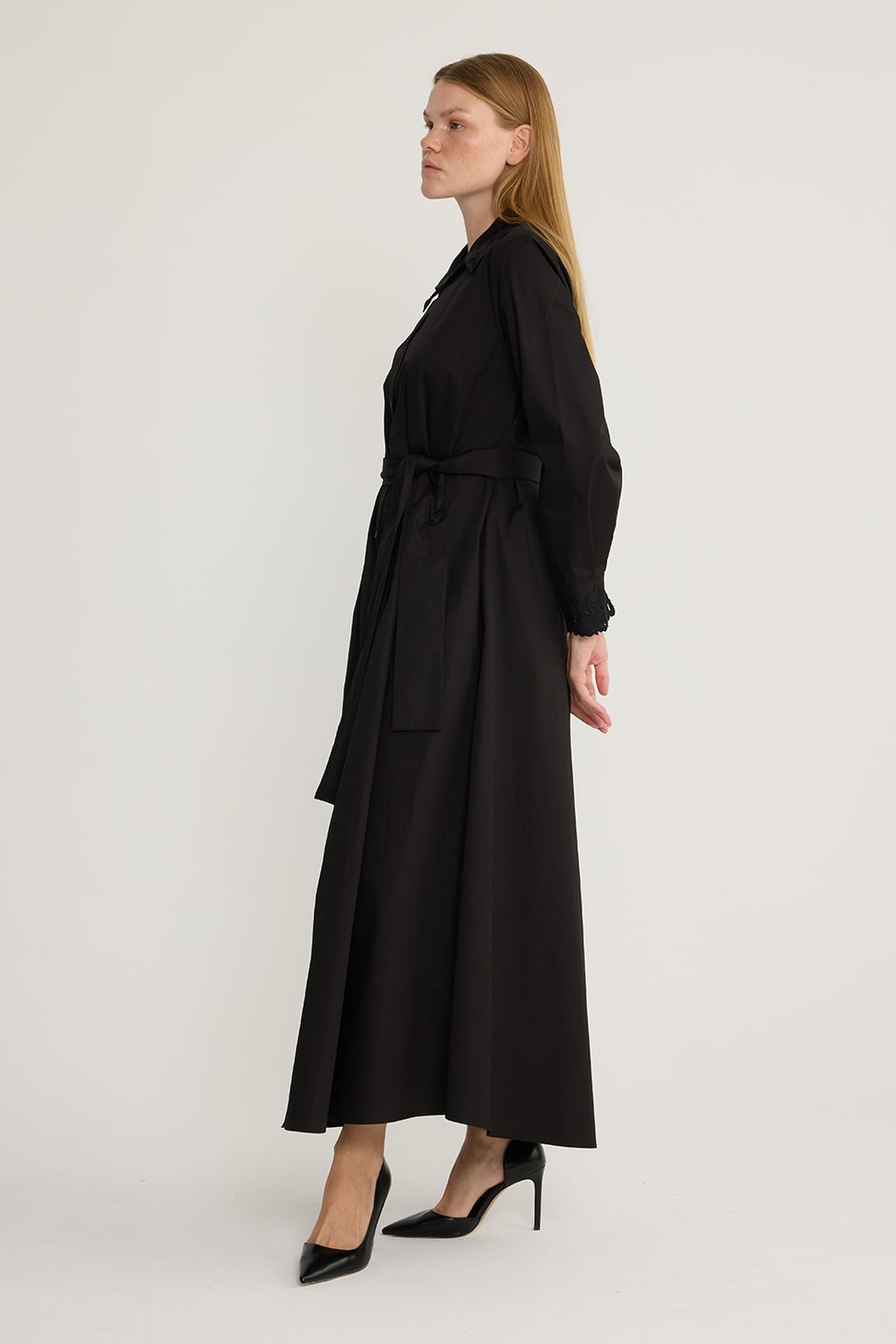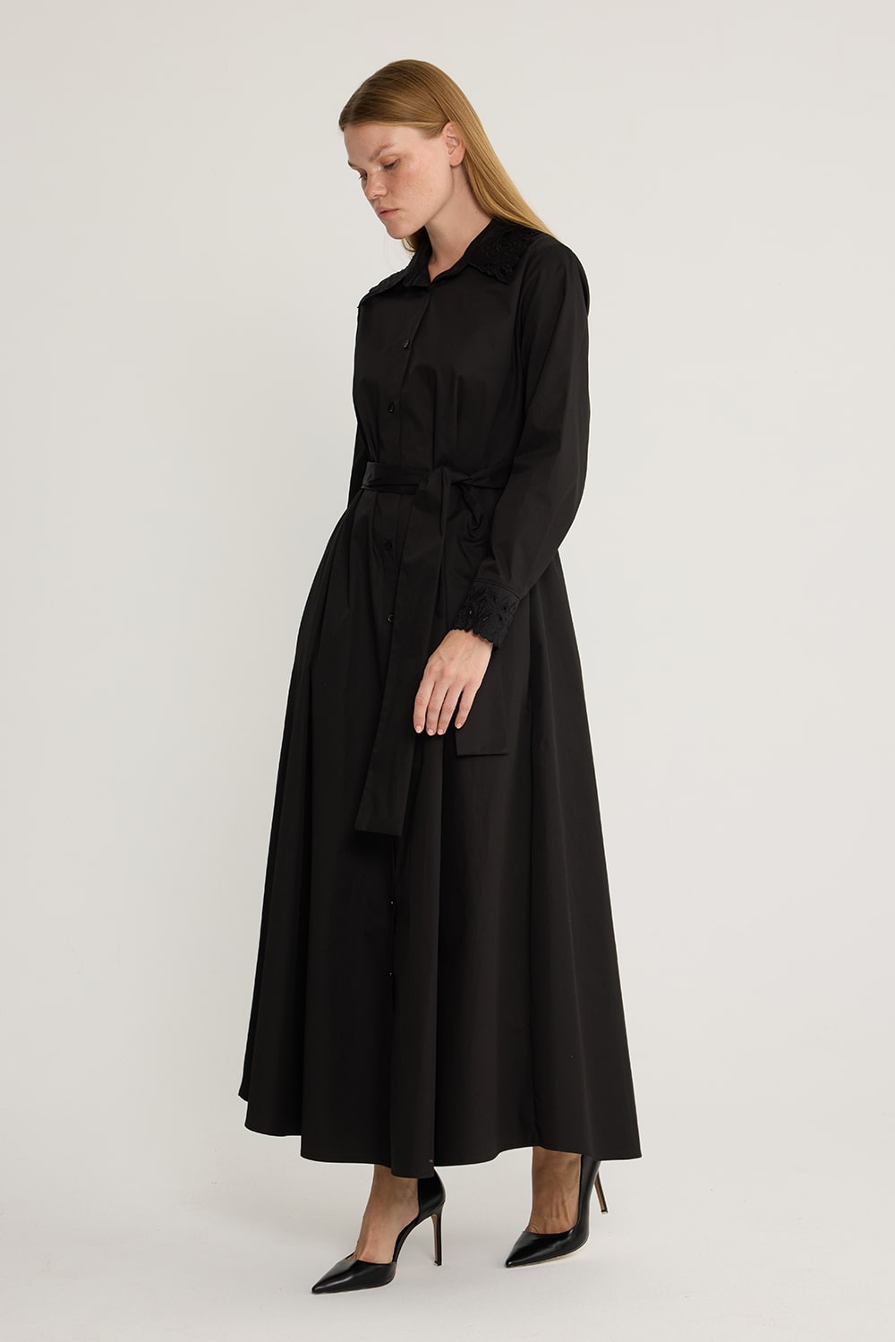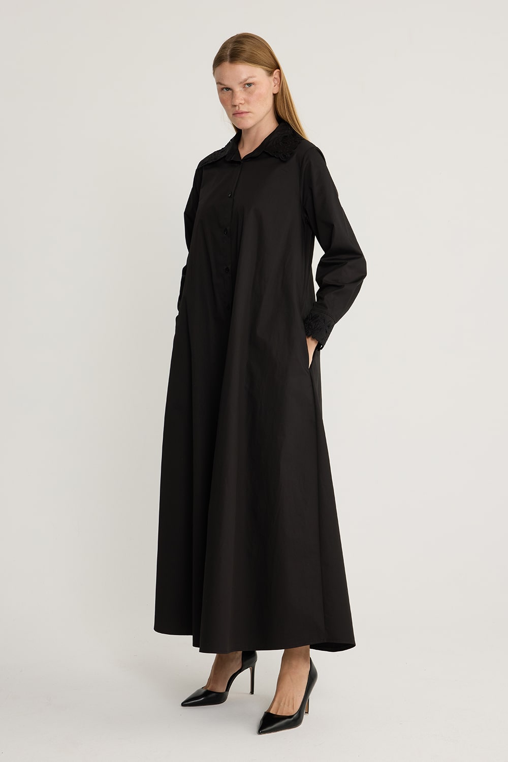 Koton kumaş, yaka ve kol manşeti nakış detaylı, boydan düğmeli, seyyar kuşaklı, cep detaylı.