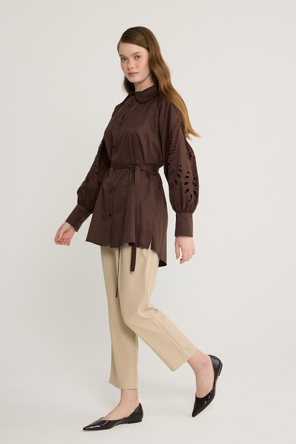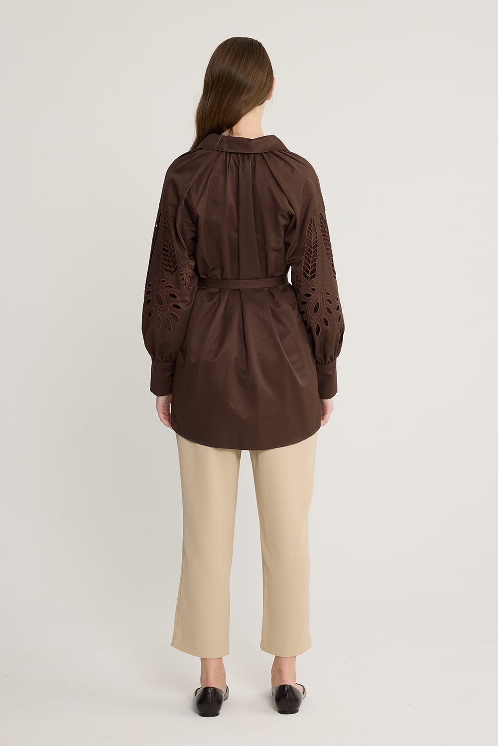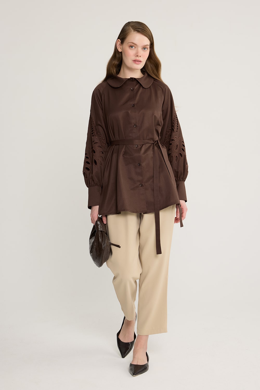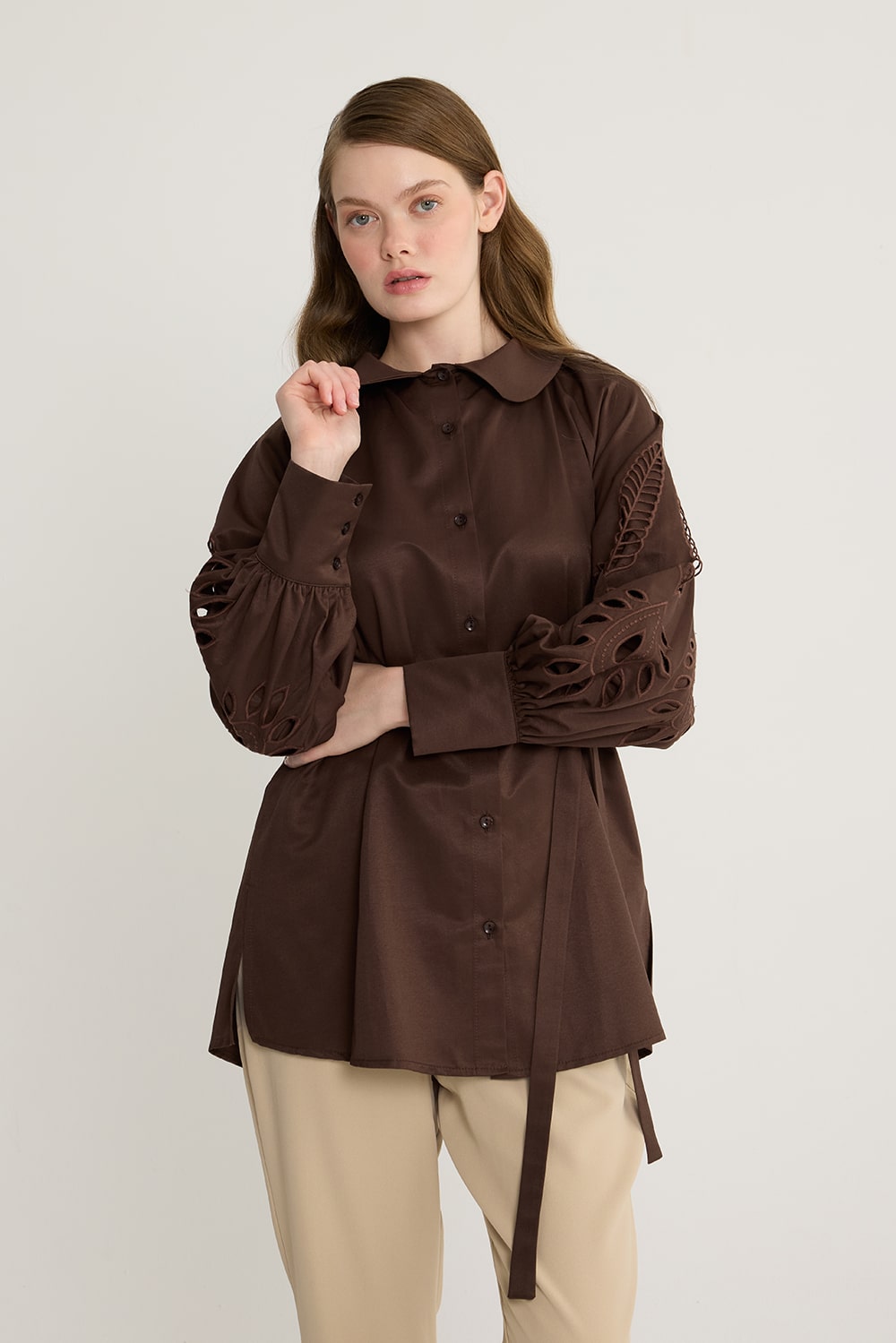 Koton kumaş, bebe yaka, kolu nakış detaylı, seyyar kuşağı mevcut, nakış kısımları kendinden astarlı olup iç göstermez.