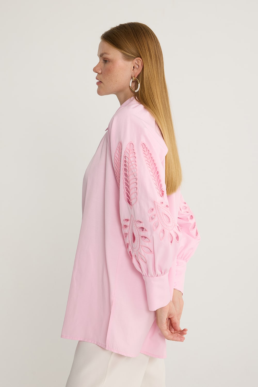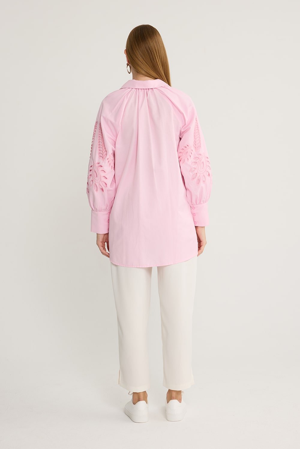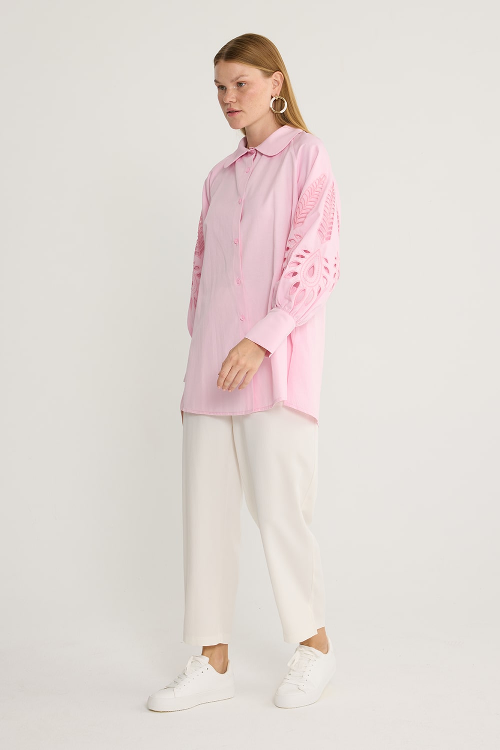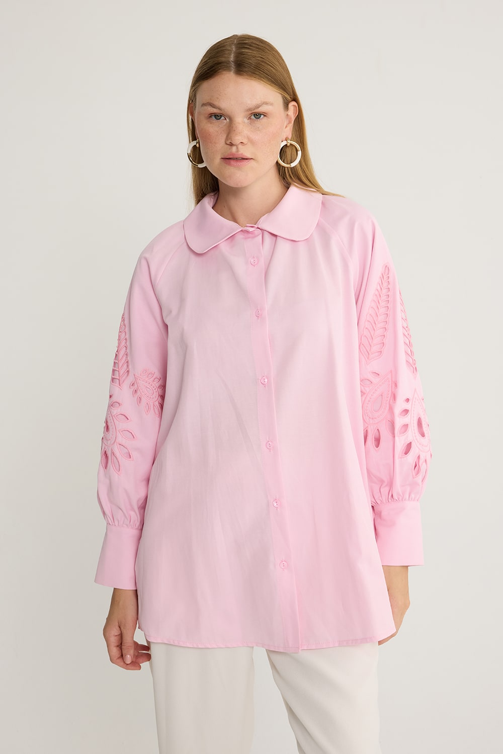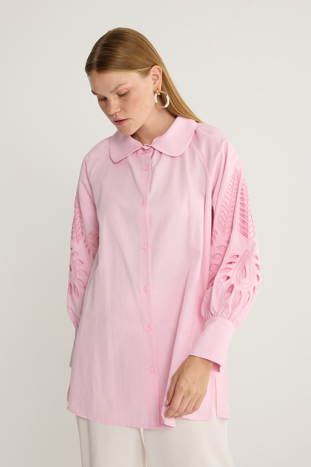 Koton kumaş, bebe yaka, kolu nakış detaylı, seyyar kuşağı mevcut, nakış kısımları kendinden astarlı olup iç göstermez.