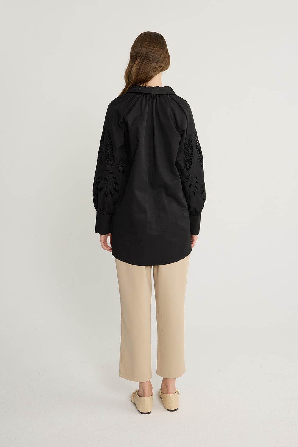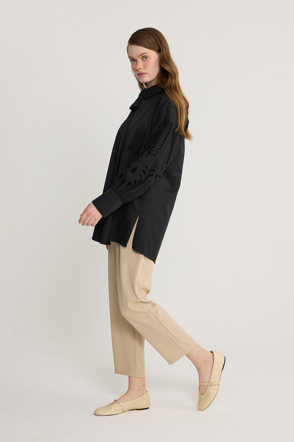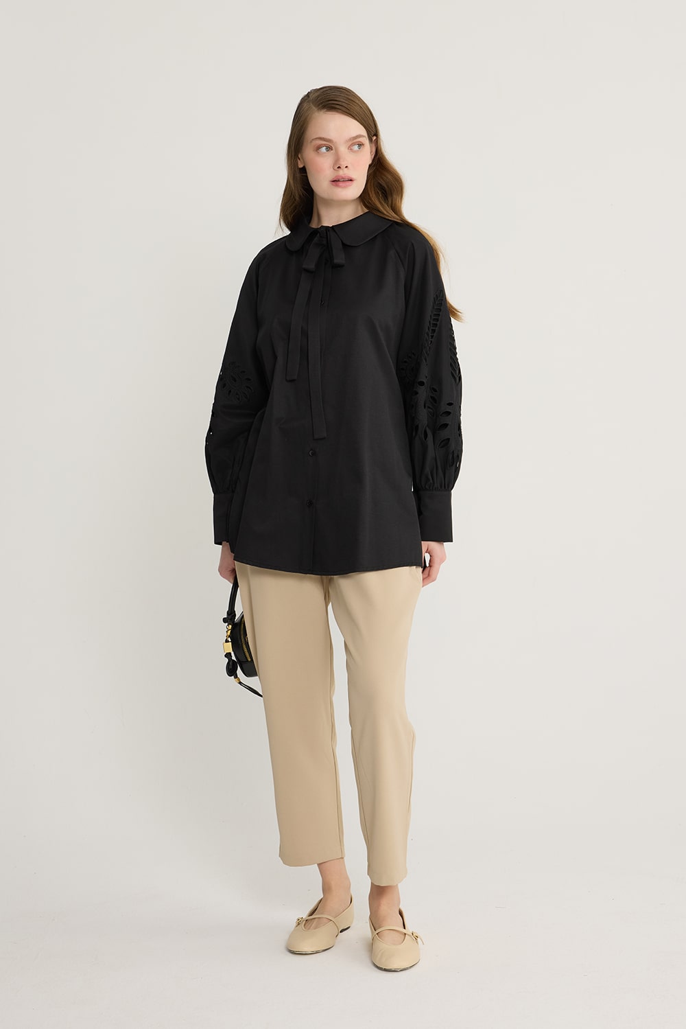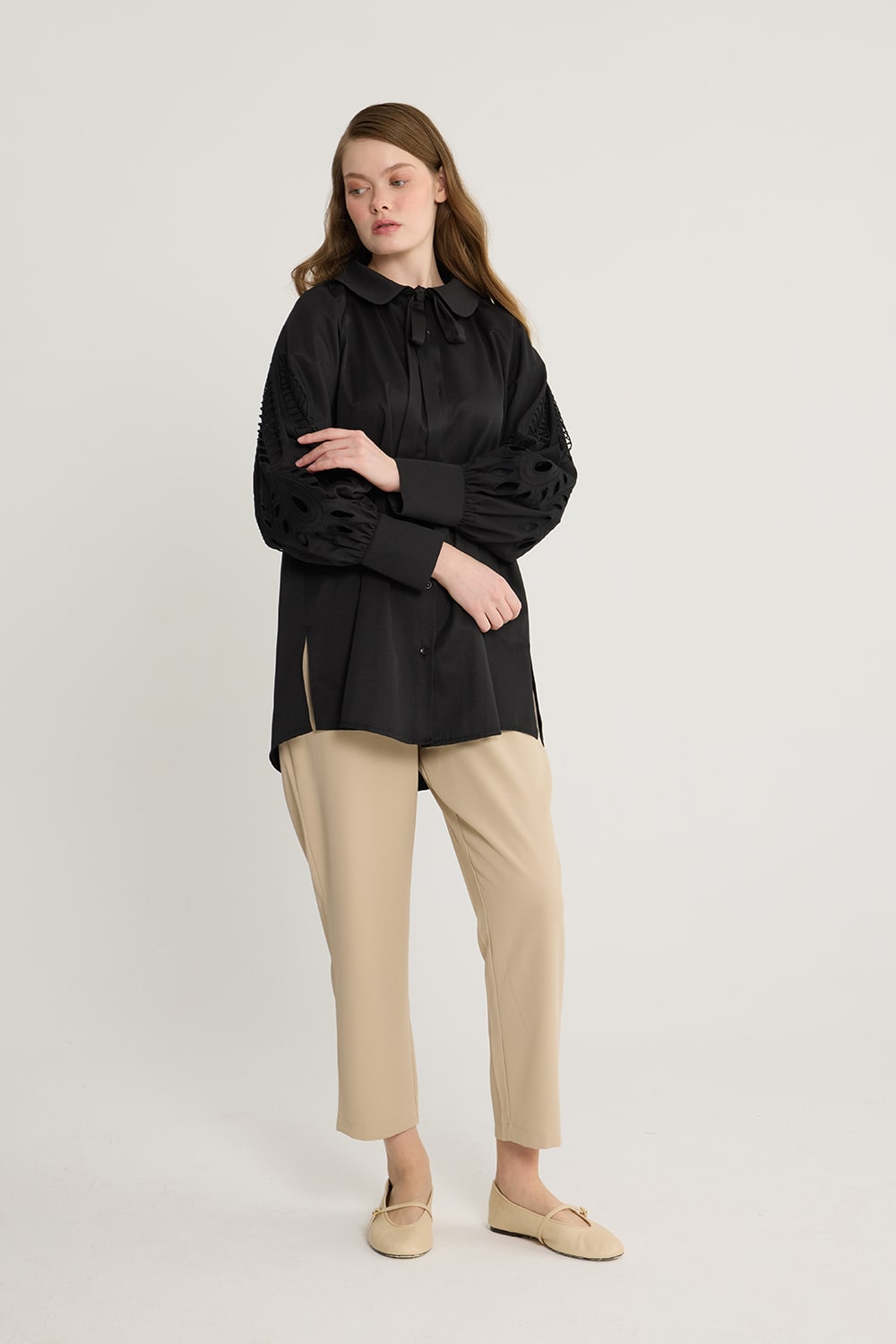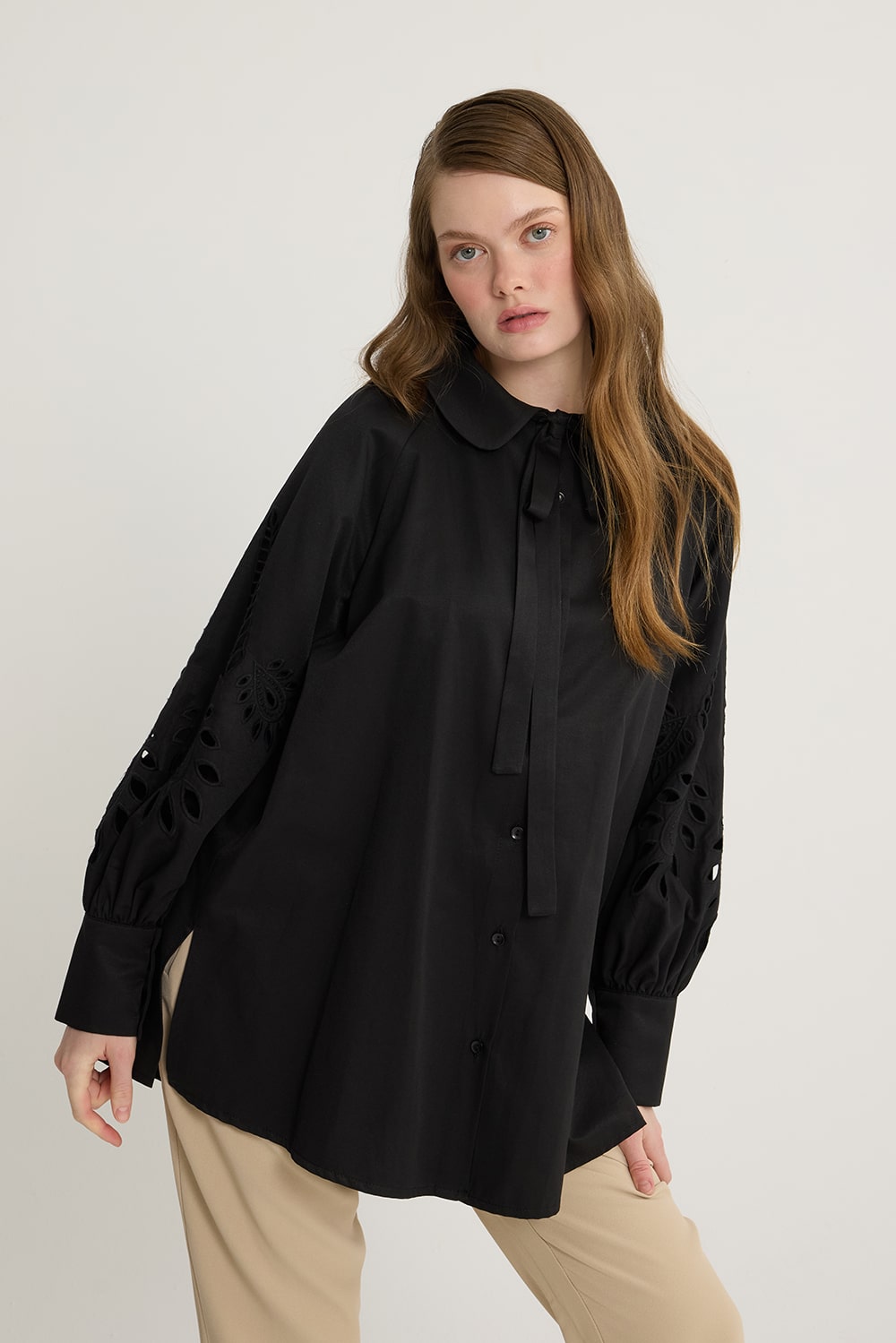 Koton kumaş, bebe yaka, kolu nakış detaylı, seyyar kuşağı mevcut, nakış kısımları kendinden astarlı olup iç göstermez.